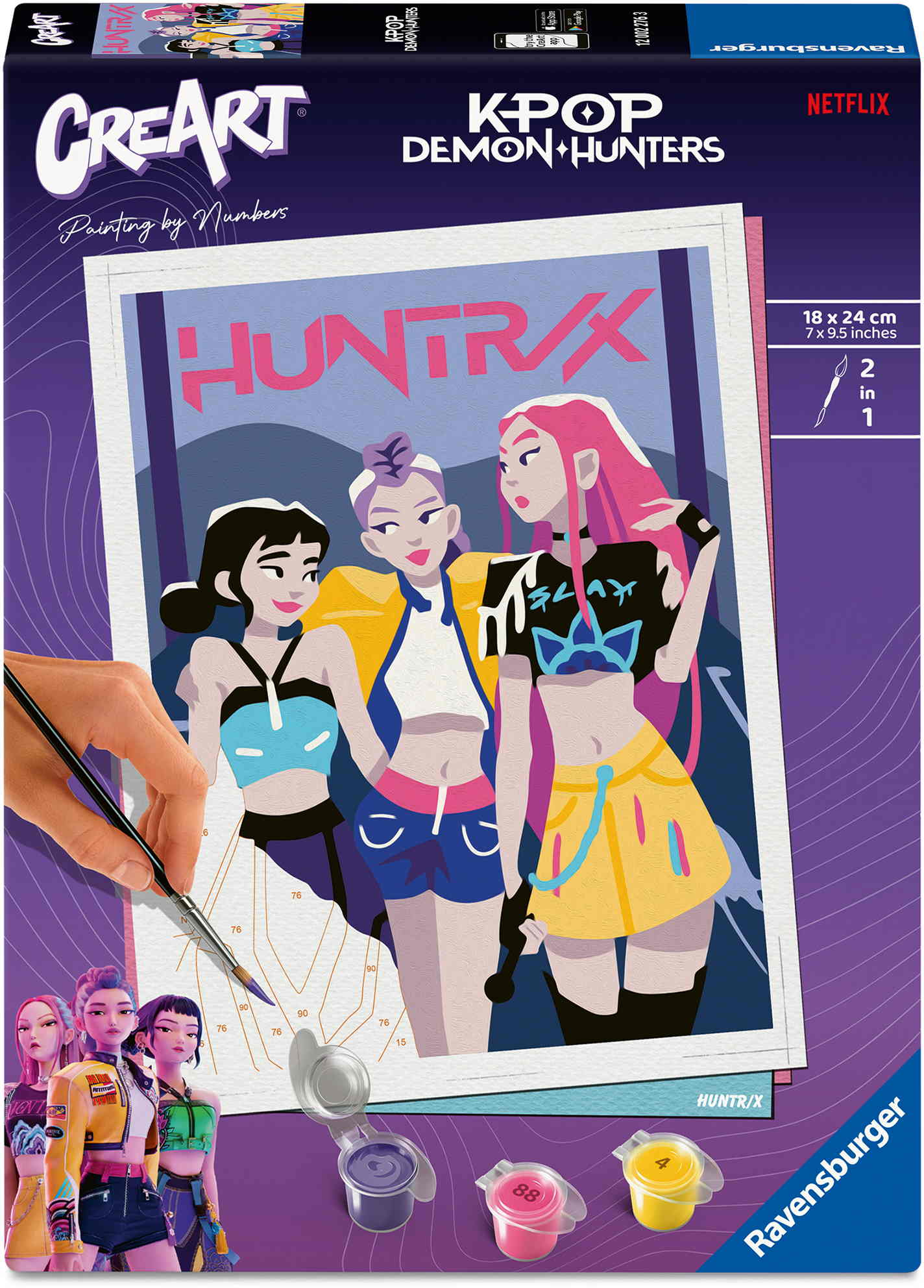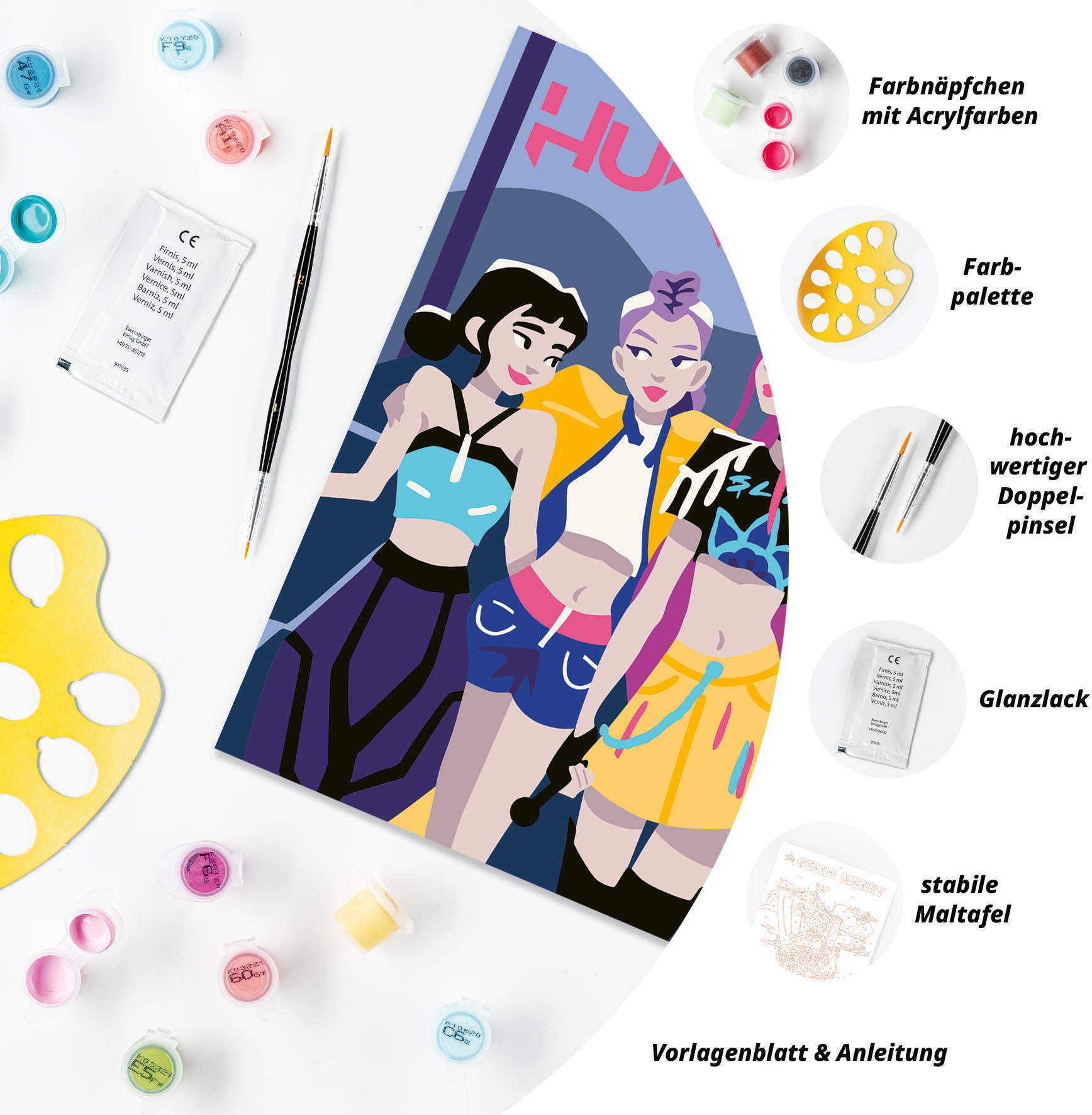 Das Malset enthält: Acrylfarben in wiederverschließbaren, nummerierten Töpfen, eine Maltafel mit den Maßen 18 cm x 24 cm, einen Pinsel, eine Anleitung – die Farben trocknen schnell, sind wasserbasiert, geruchsneutral und erfordern keinen Pinselreiniger