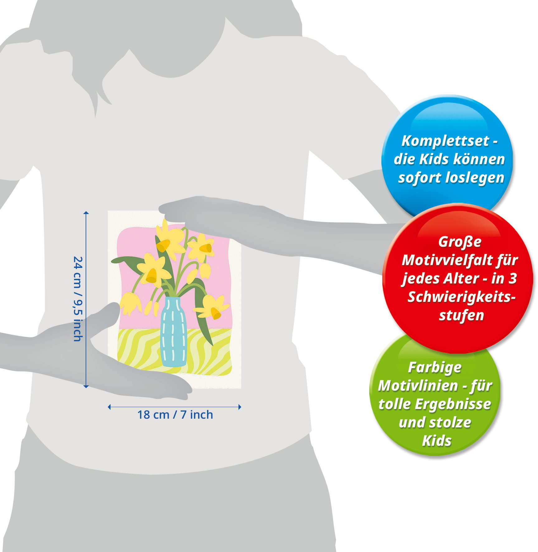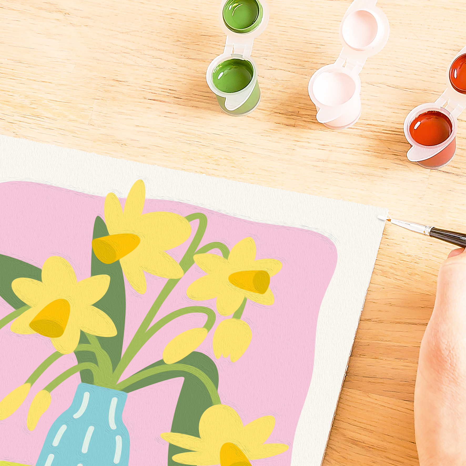 Das Malset enthält: Acrylfarben in wiederverschließbaren, nummerierten Töpfen, eine Maltafel mit den Maßen 18 cm x 24 cm, einen Pinsel, eine Anleitung – die Farben trocknen schnell, sind wasserbasiert, geruchsneutral und erfordern keinen Pinselreiniger