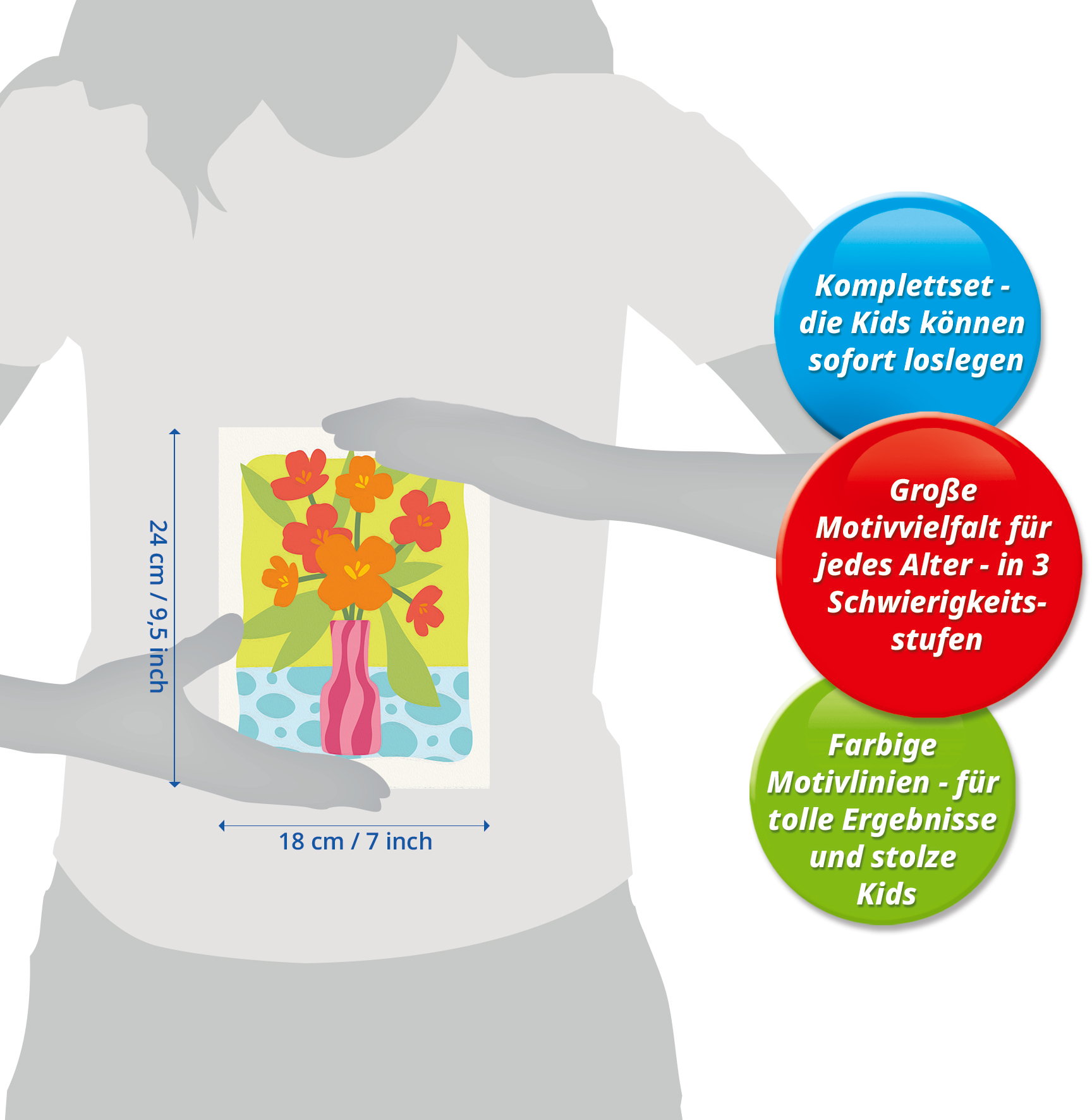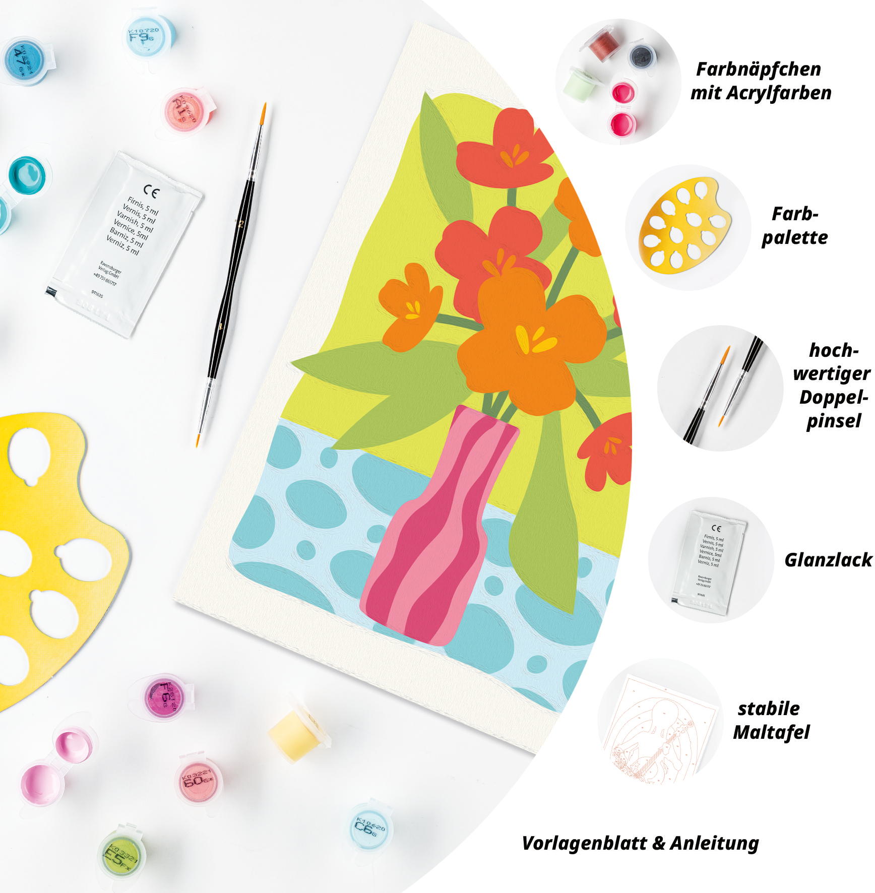 Das Malset enthält: Acrylfarben in wiederverschließbaren, nummerierten Töpfen, eine Maltafel mit den Maßen 18 cm x 24 cm, einen Pinsel, eine Anleitung – die Farben trocknen schnell, sind wasserbasiert, geruchsneutral und erfordern keinen Pinselreiniger