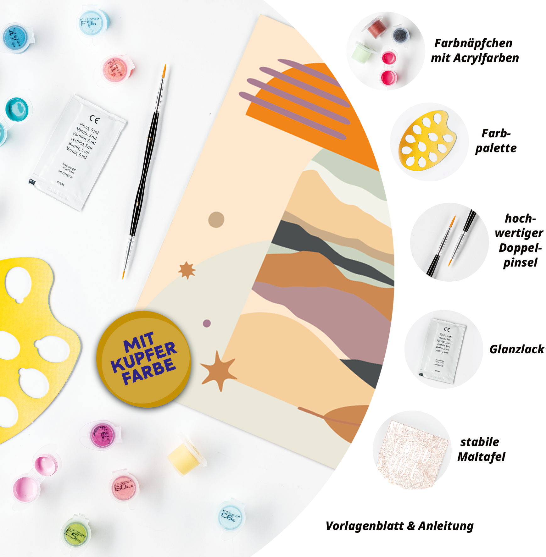 1 Maltafel, 13 Acrylfarben auf Wasserbasis in wiederverschließbaren Näpfchen, 1 Qualitätspinsel, Farbpalette und Anleitung.