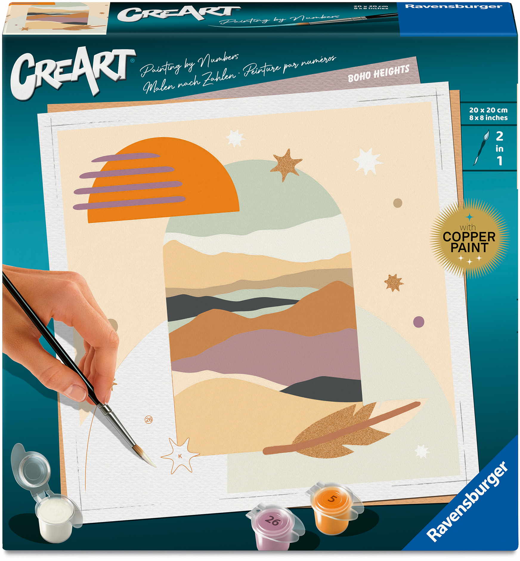 Das Malset enthält: Acrylfarben in wiederverschließbaren, nummerierten Töpfen, eine Maltafel mit den Maßen 20,00 cm x 20,00 cm, einen Pinsel, eine Anleitung – die Farben trocknen schnell, sind wasserbasiert, geruchsneutral und erfordern keinen Pinselreiniger