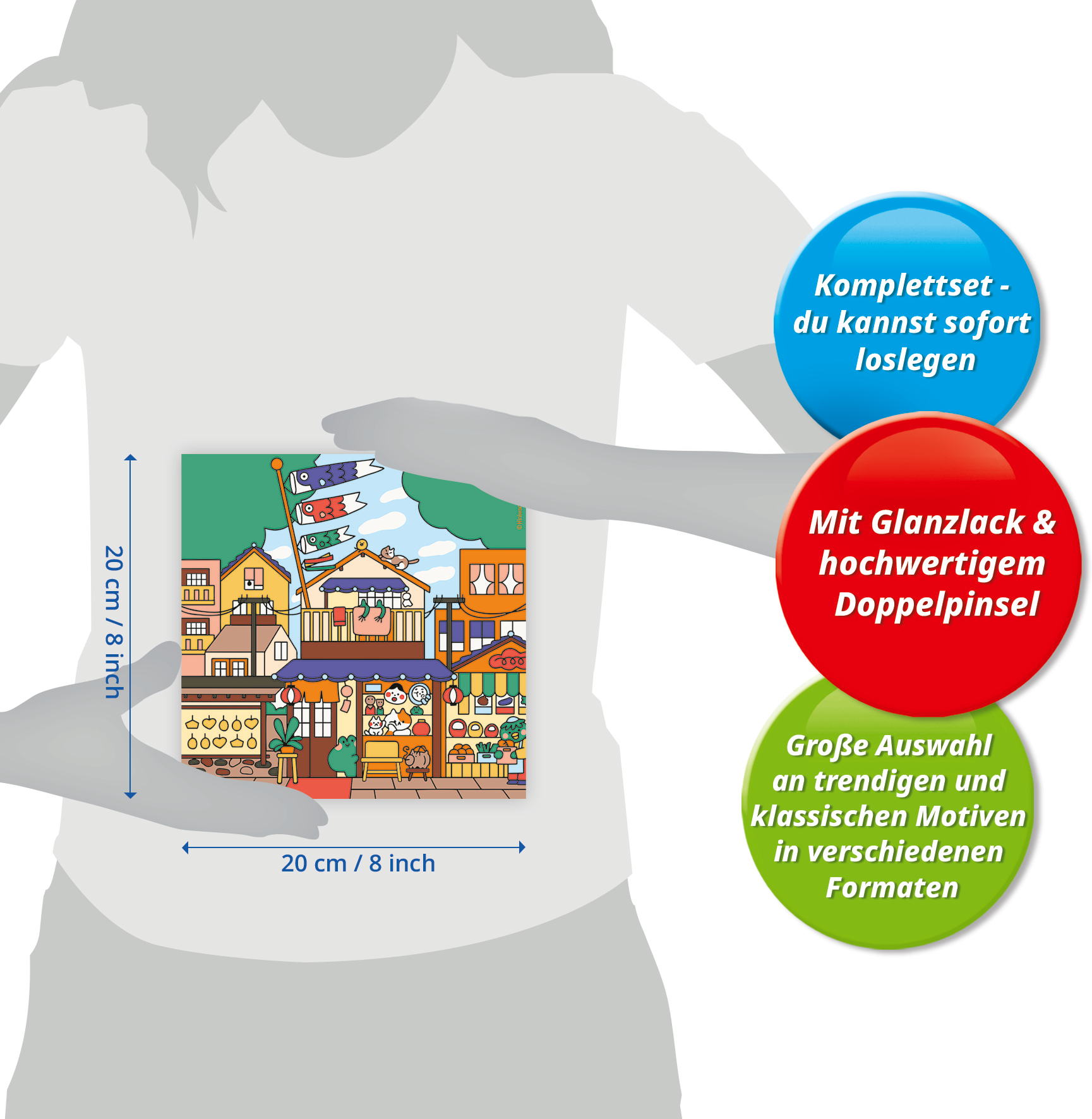 Das Malset enthält: Acrylfarben in wiederverschließbaren, nummerierten Töpfen, eine Maltafel mit den Maßen 20,00 cm x 20,00 cm, einen Pinsel, eine Anleitung – die Farben trocknen schnell, sind wasserbasiert, geruchsneutral und erfordern keinen Pinselreiniger