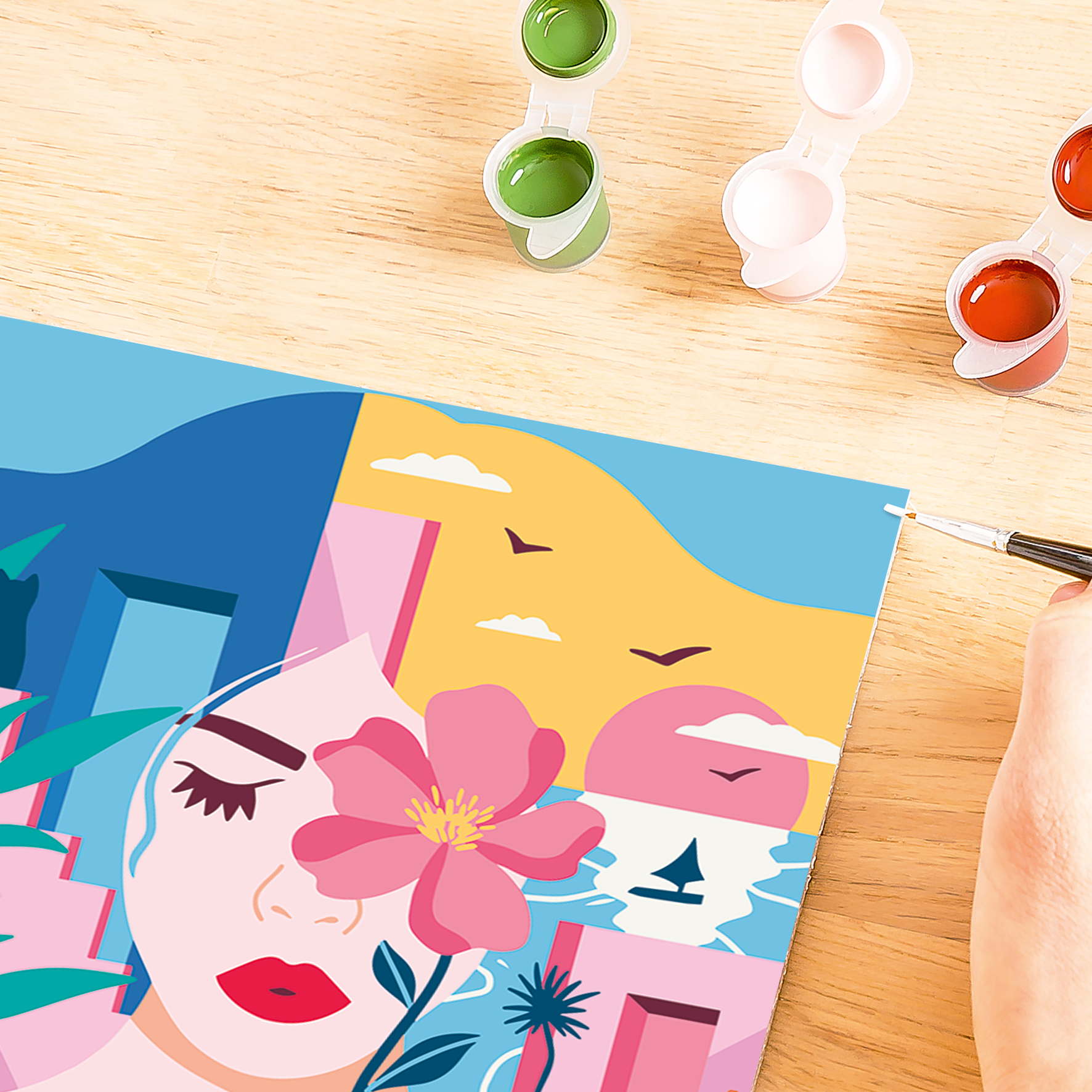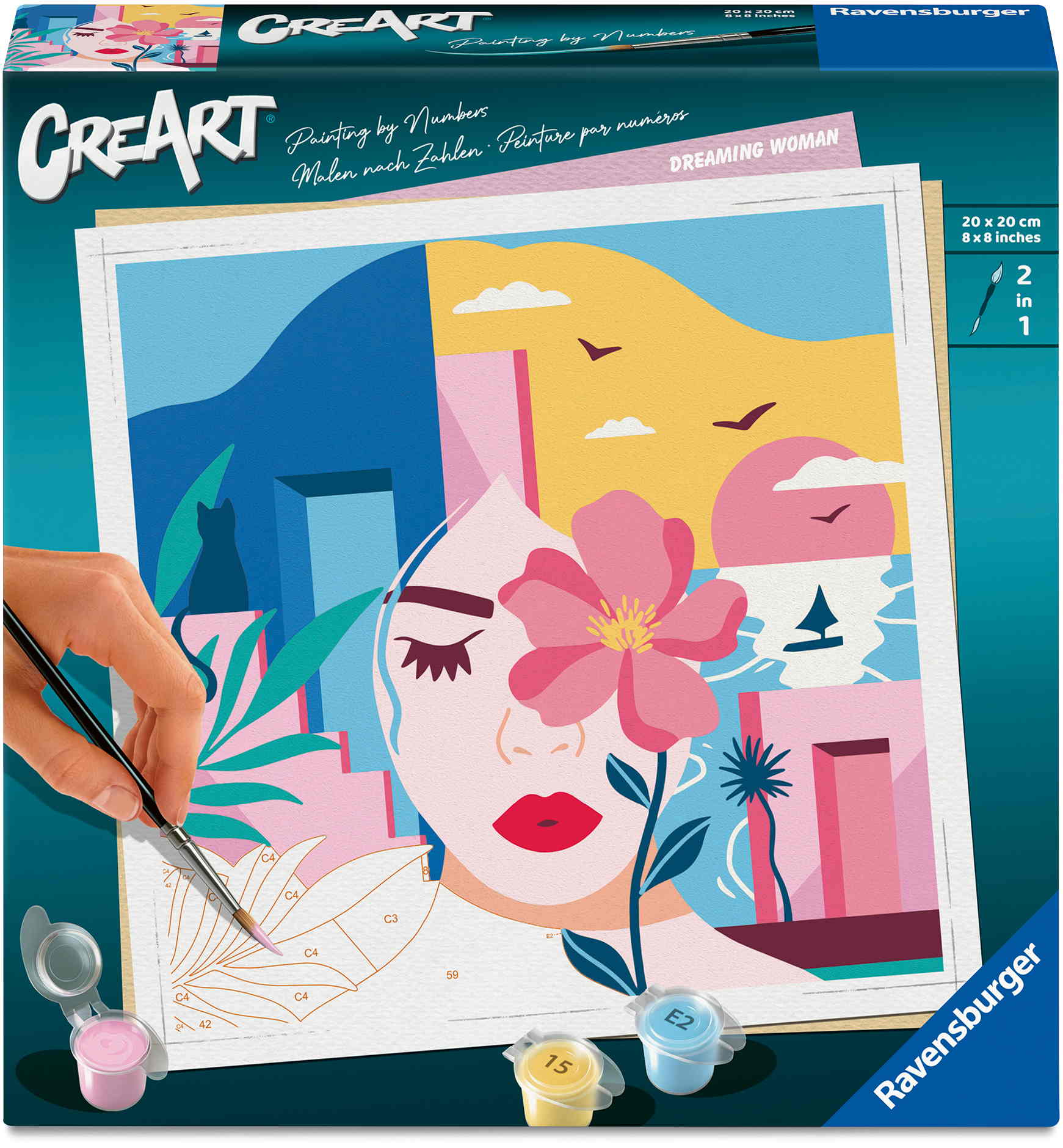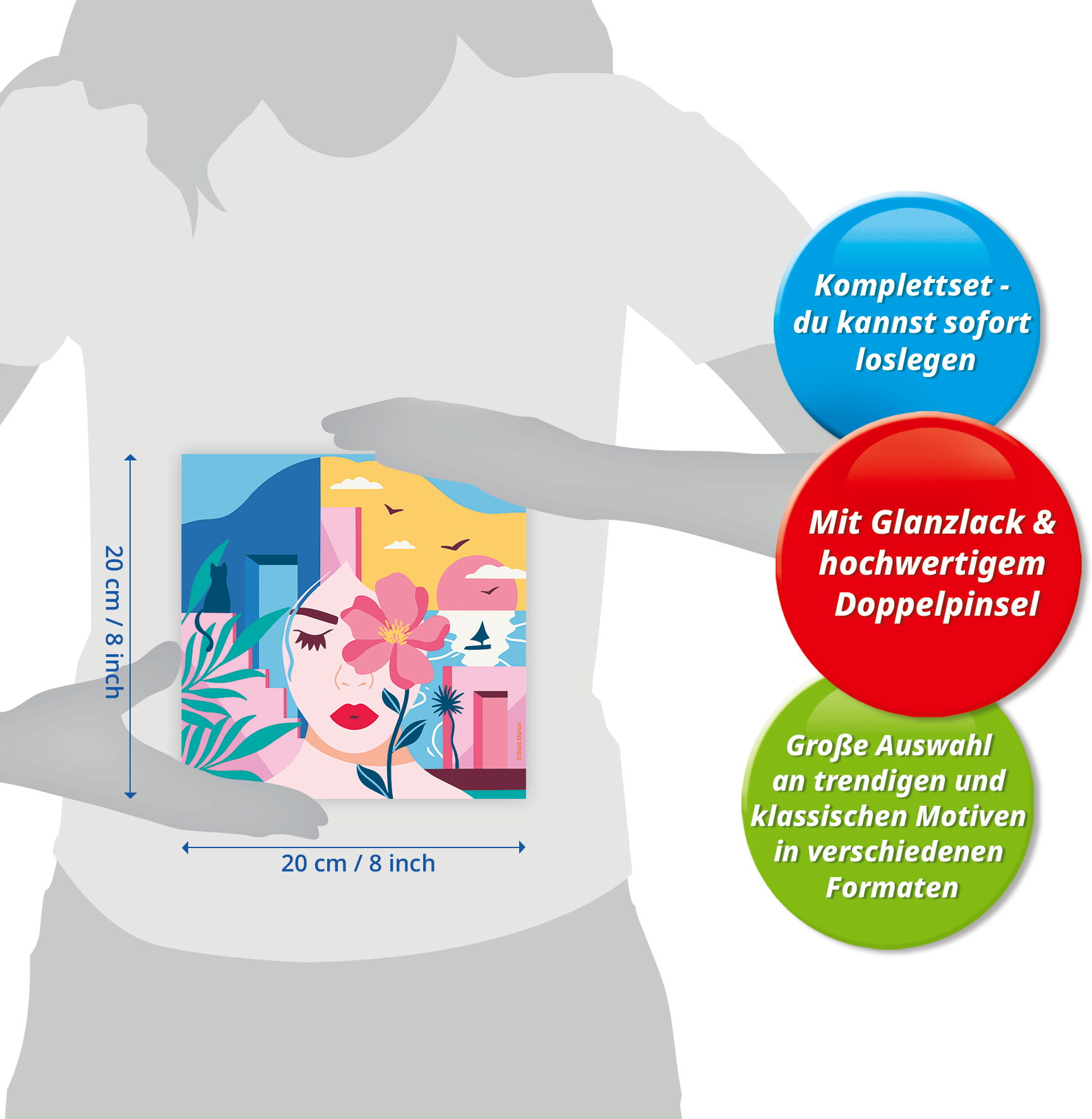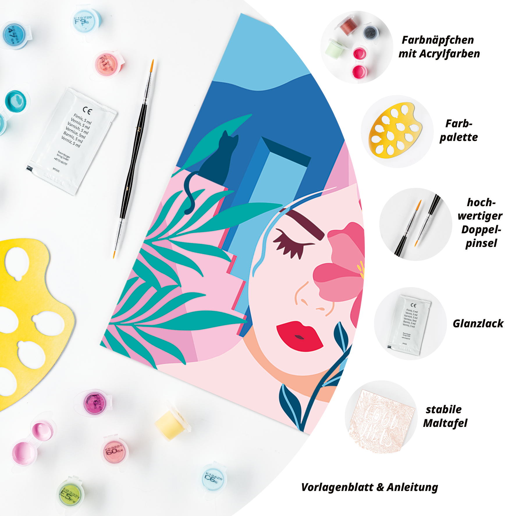 1 Maltafel (20 x 20 cm), 15 Acrylfarben auf Wasserbasis in wiederverschließbaren Näpfchen, 1 Qualitätspinsel, Farbpalette und Anleitung.