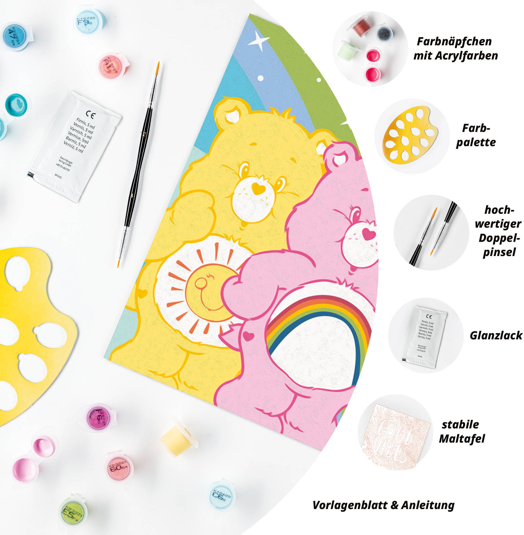 1 Maltafel, 12 Acrylfarben auf Wasserbasis in wiederverschließbaren Näpfchen, 1 Qualitätspinsel, Farbpalette und Anleitung.