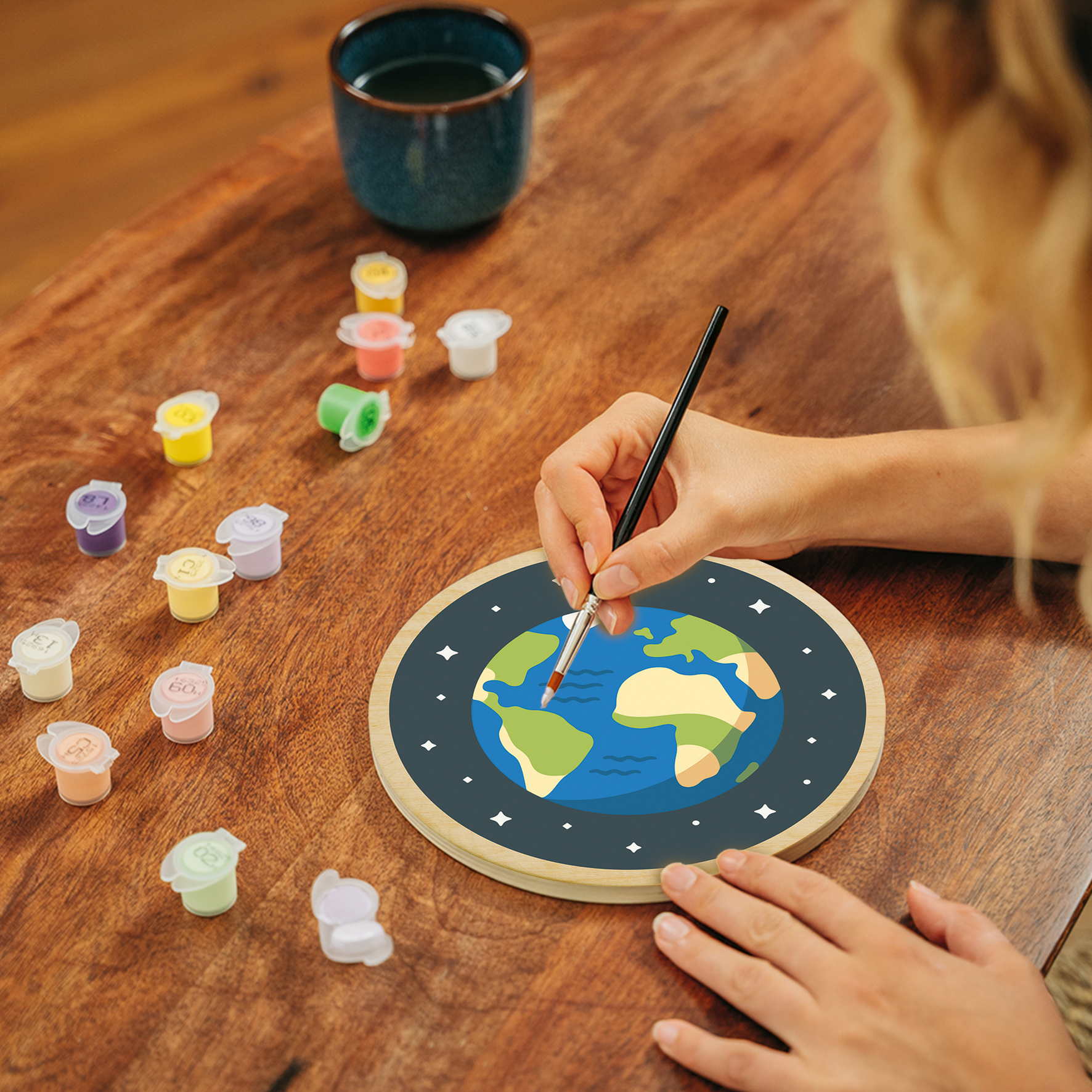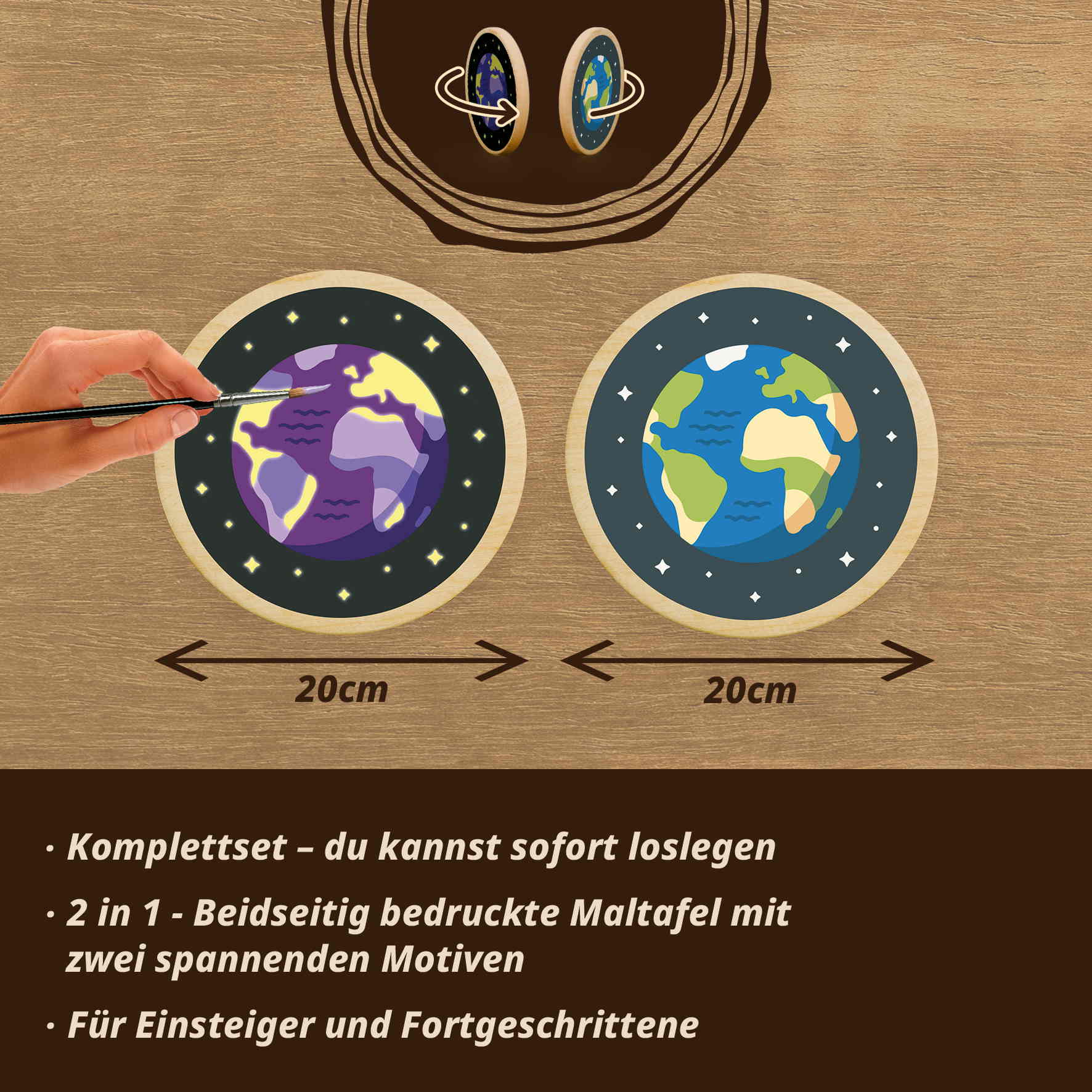 Das Malset enthält: Acrylfarben in wiederverschließbaren, nummerierten Töpfchen, eine hölzerne Maltafel mit einem Durchmesser von 20 cm und beidseitigem Aufdruck, zwei Pinsel, Metallösen, Perlen und eine Schnur zum Aufhängen der Maltafel, ein Vorlageblatt – die Farben trocknen schnell, sind wasserbasiert und geruchsneutral