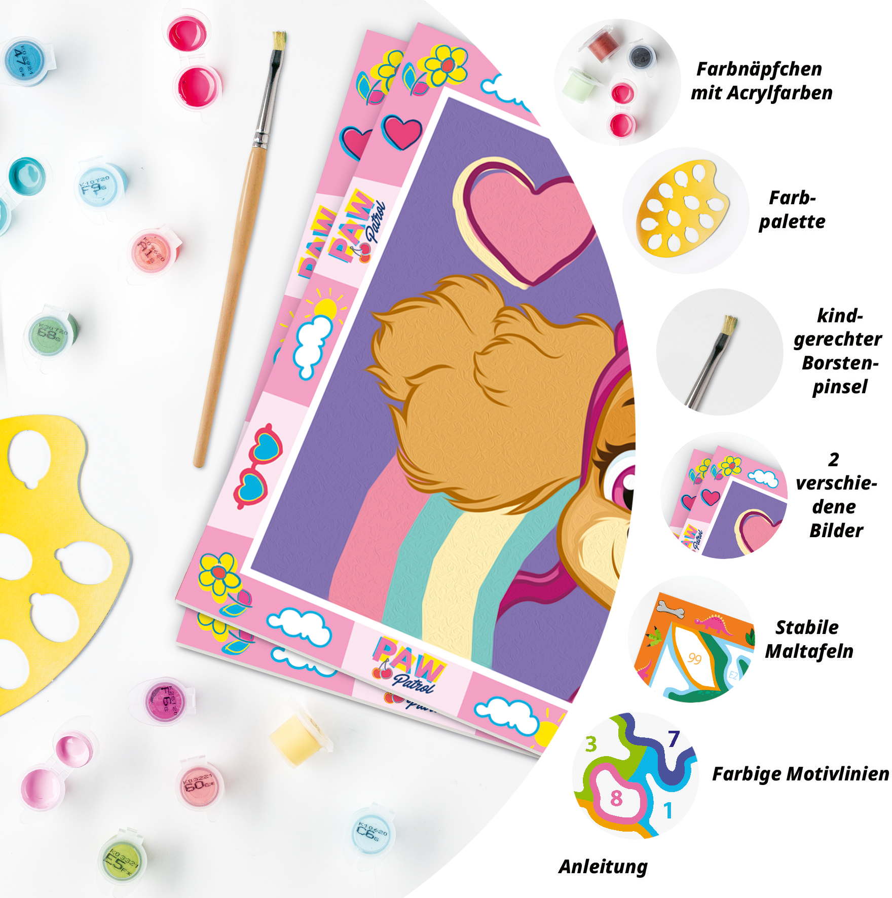 2 Maltafeln, 5 Acrylfarben auf Wasserbasis in wiederverschließbaren Näpfchen, 1 Qualitätspinsel, Farbpalette und Anleitung.