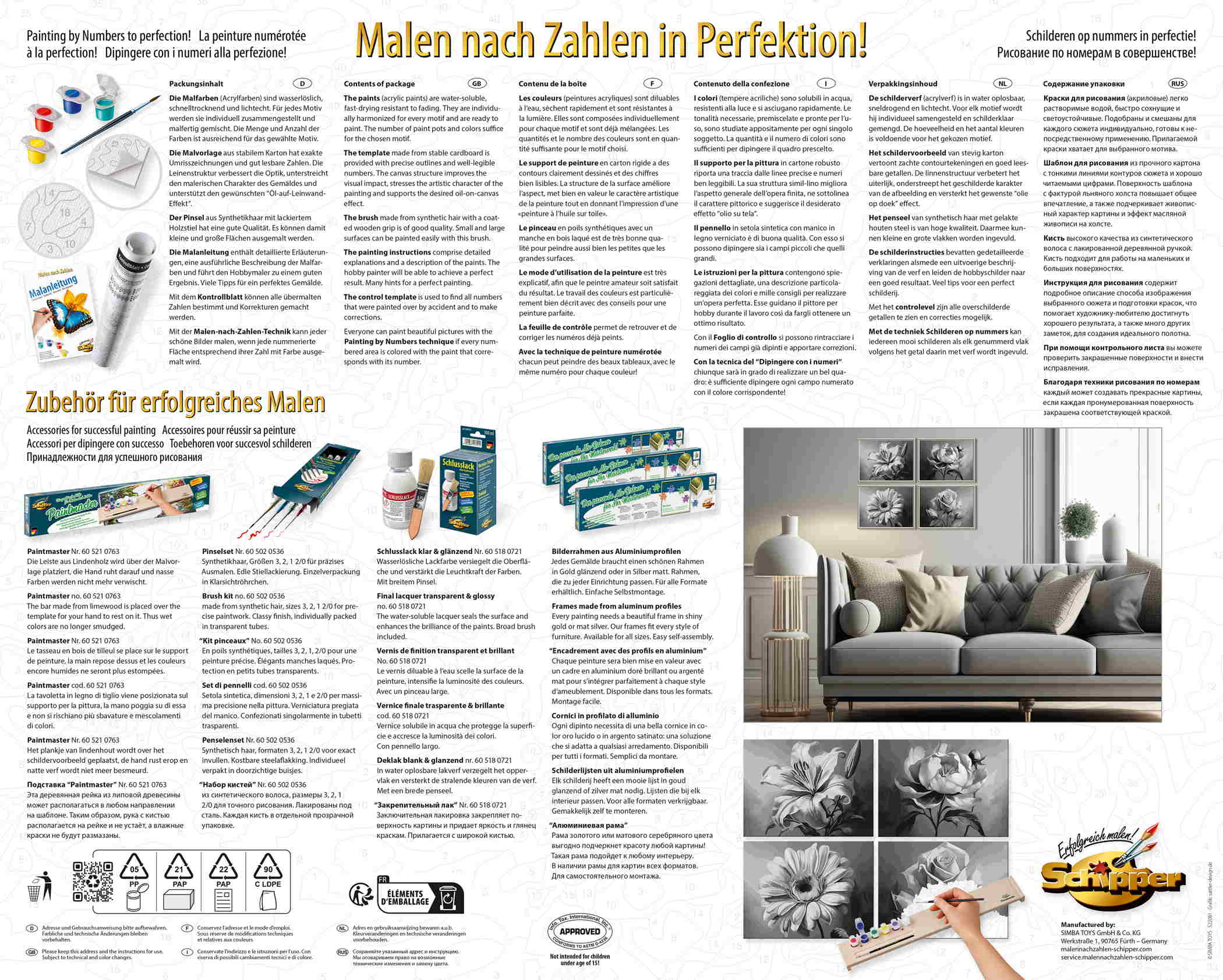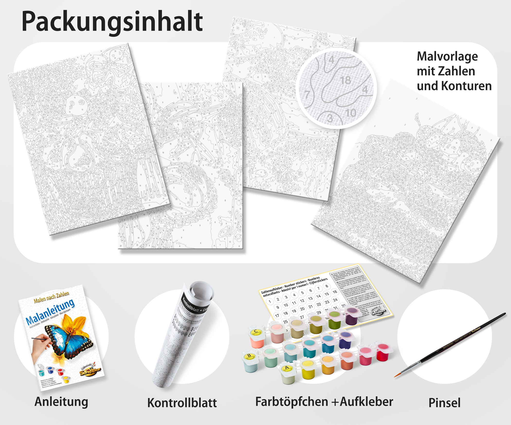 4 stabile Malkartons 18 x 24 cm mit Leinenstruktur. Exakte Konturenzeichnungen mit gut lesbaren Zahlen. Acrylfarben auf Wasserbasis. Kein Farbmischen erforderlich. Feiner Malpinsel. Kontrollblatt und ausführliche Anleitung für erfolgreiches Malen.