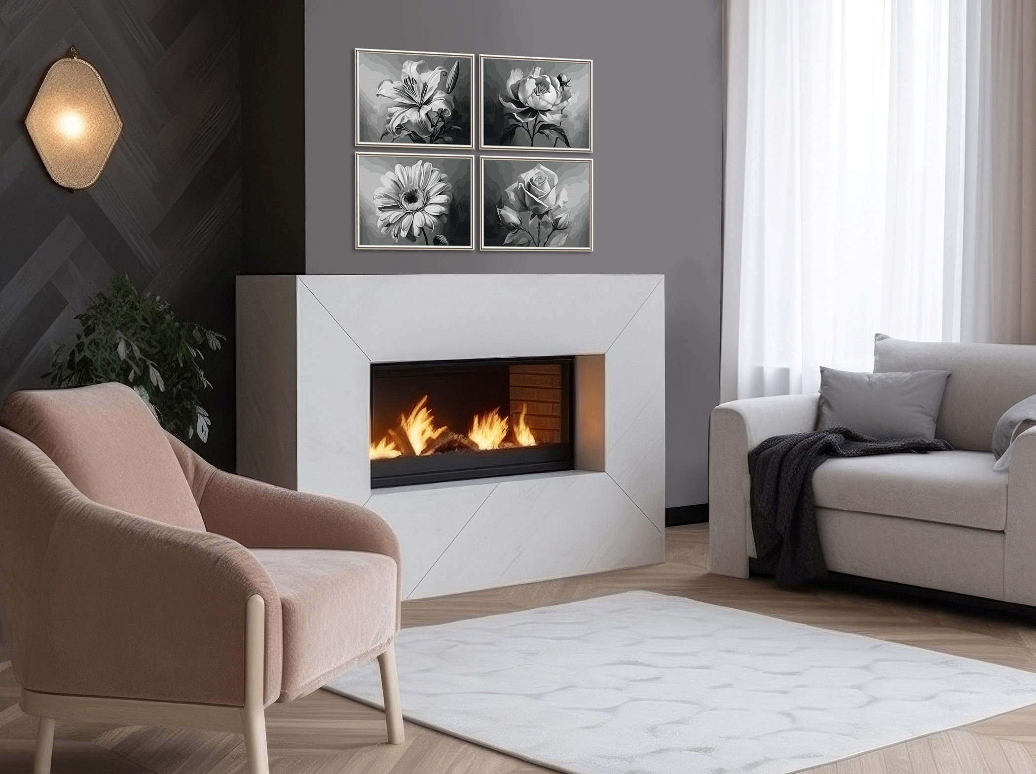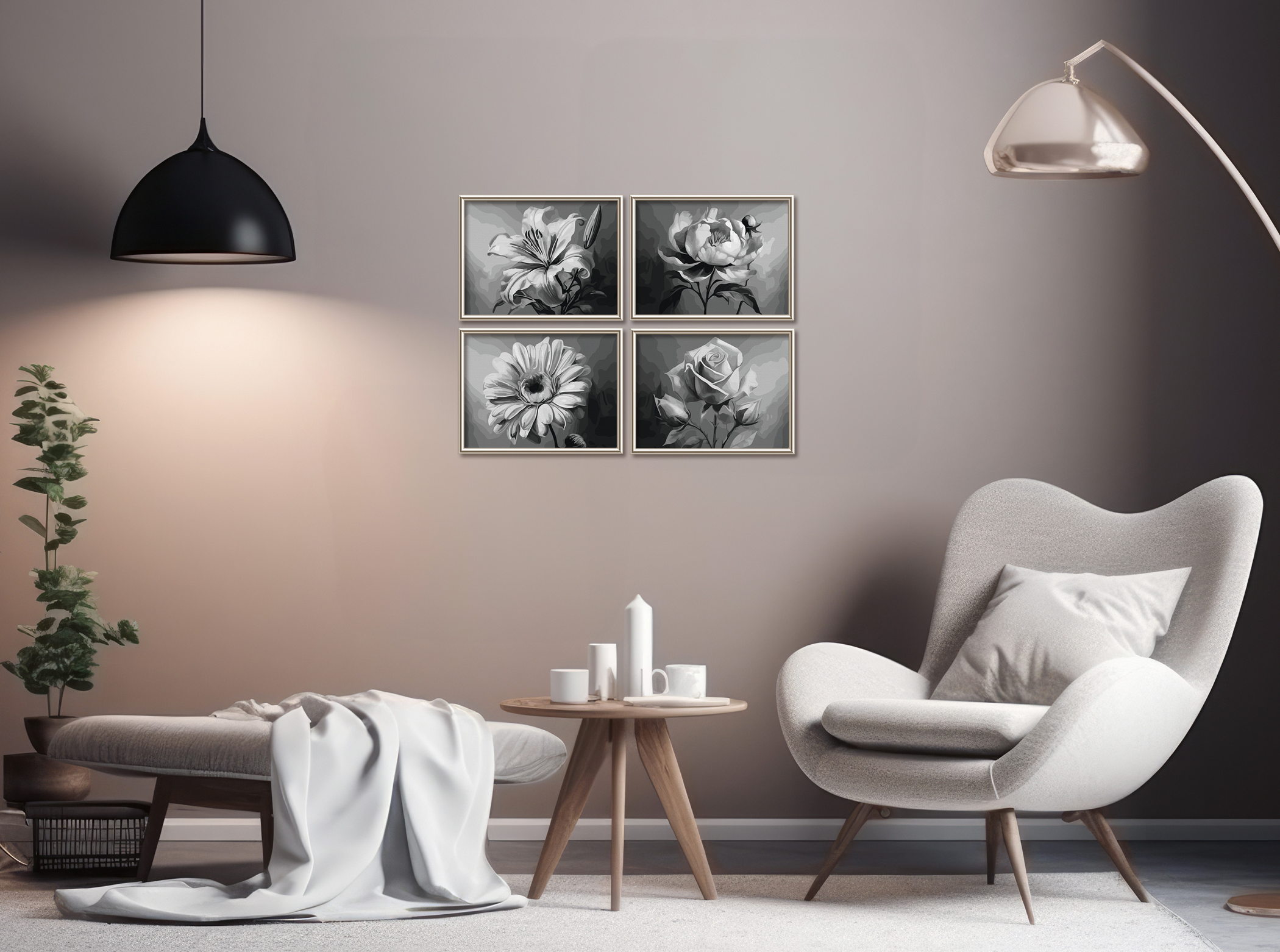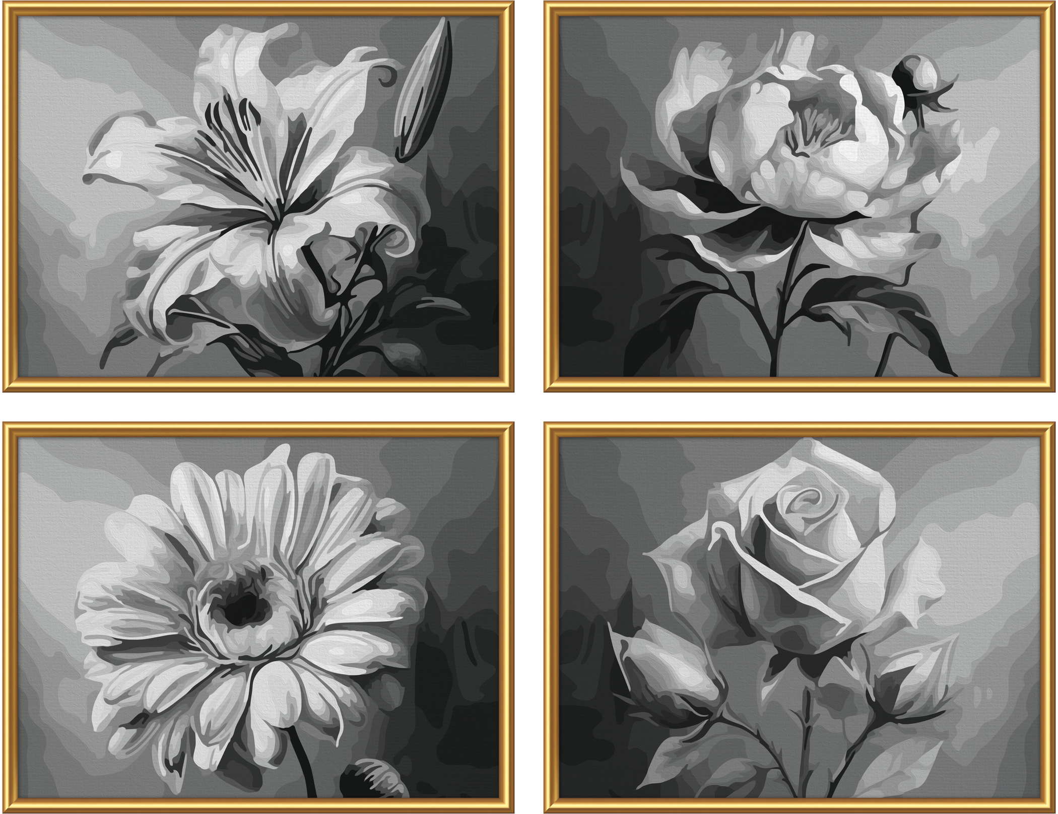 Vier Blüten, vier Stimmungen, ein harmonisches Gesamtbild – das Motiv „Blumenvielfalt" vereint die Schönheit der Natur in einem eleganten Quattro-Format. Lilie, Pfingstrose, Gerbera und Rose präsentieren sich in einer eindrucksvollen Komposition aus Licht und Schatten. Die monochrome Farbgebung hebt die feinen Strukturen und zarten Konturen der Blüten hervor und verleiht dem Bild eine zeitlose Eleganz. Die dezente Farbpalette passt sich stilvoll modernen Wohnräumen an und schafft eine beruhigende Atmosphäre. Ein Kunstwerk, das klassische Schönheit mit minimalistischer Ästhetik verbindet.