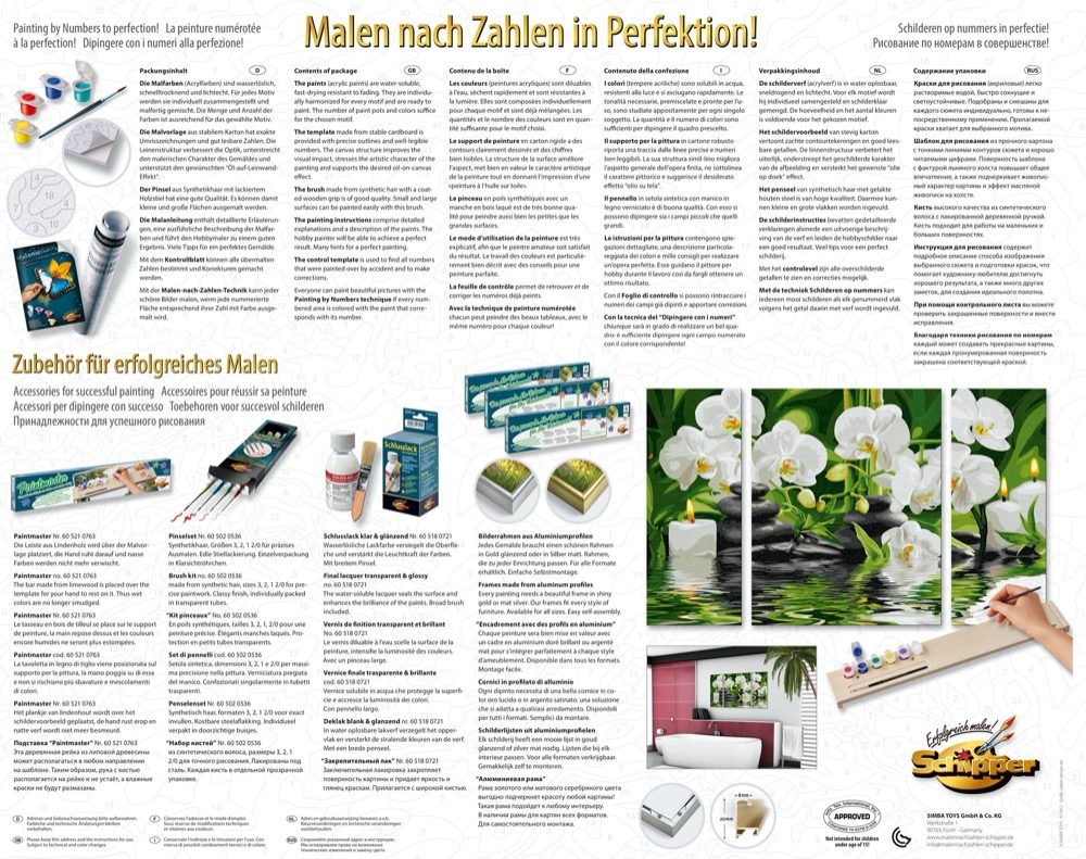 3 stabile Malkartons mit Leinenstruktur. Mittelbild 40 x 50 cm. Seitenbilder je 20 x 50 cm. Exakte Konturenzeichnungen mit gut lesbaren Zahlen. Acrylfarben auf Wasserbasis. Kein Farbmischen erforderlich. Feiner Malpinsel. Kontrollblatt und ausführliche Anleitung für erfolgreiches Malen.