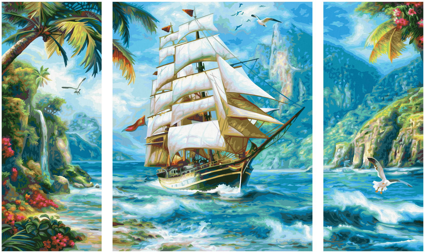 ürkisblaues Wasser, sanfte Wellen und ein stolzes Segelschiff, das ruhig seinen Kurs hält – mit diesem hochwertigen Malen-nach-Zahlen-Set holst du dir Urlaubsfeeling und maritimes Flair direkt nach Hause. Das dreiteilige Bild zeigt eine tropische Küstenlandschaft mit Palmen, Felsen und einem imposanten Dreimaster, der durch die Lagune gleitet. Die Szene erinnert an einen stillen Moment in der Südsee und lädt dazu ein, beim Malen den Alltag hinter sich zu lassen. Das Motiv eignet sich ideal für alle, die sich beim Malen gerne in ferne Landschaften träumen, ohne Koffer packen zu müssen. Pinselstrich für Pinselstrich entsteht ein detailreiches Kunstwerk, das nicht nur den Raum mit Leichtigkeit erfüllt, sondern auch ein kleines Stück Fernweh stillt. Ein ideales Malprojekt für (junge) Erwachsene, die Entspannung, Achtsamkeit und kreative Auszeiten schätzen.