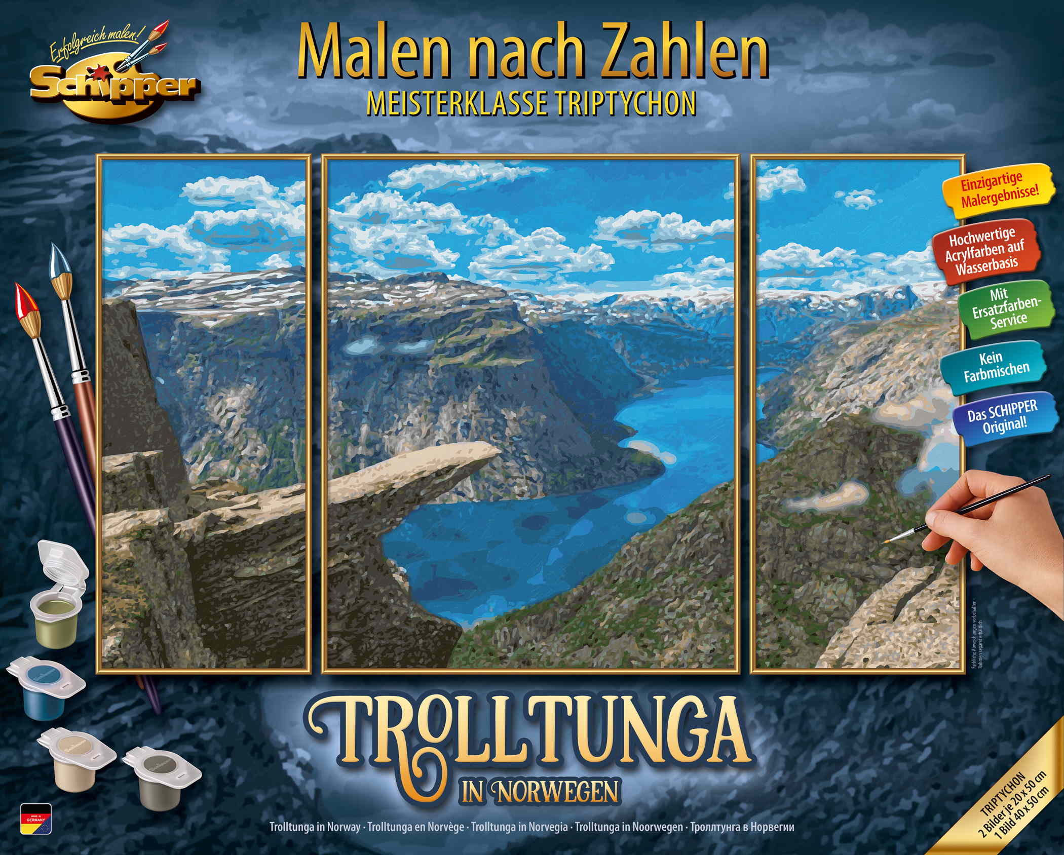3 stabile Malkartons mit Leinenstruktur. Mittelbild 40 x 50 cm. Seitenbilder je 20 x 50 cm. Exakte Konturenzeichnungen mit gut lesbaren Zahlen. Acrylfarben auf Wasserbasis. Kein Farbmischen erforderlich. Feiner Malpinsel. Kontrollblatt und ausführliche Anleitung für erfolgreiches Malen.