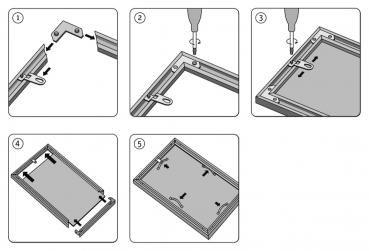 8 Rahmenleisten für 2 Bilderrahmen 24 x 30 cm mit Befestigungsmaterial (Eckverbinder, Federn, Aufhänger und Schrauben), Montageanleitung.