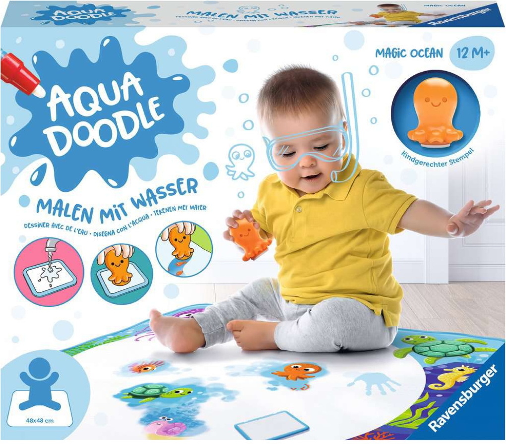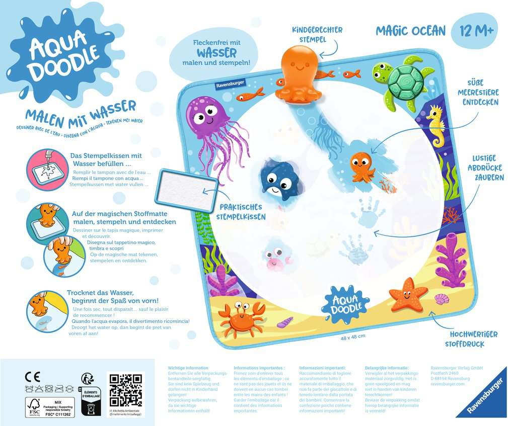 Aquadoodle Magic Ocean zum allerersten Stempeln und Entdecken für Kleinkinder ab 12 Monaten sicher und sauber mit reinem Wasser. Einfach Stempelkissen befeuchten und die magische Meereswelt entdecken. Das Geheimnis: In Kontakt mit Wasser wird die Oberfläche durchsichtig. Trocknet das Wasser, verschwinden die Bilder und der Stempelspaß beginnt von Neuem. Aquadoodle von Ravensburger steht für höchste Qualität in Funktion und Verarbeitung und garantiert sicheren und langlebigen Stempelspaß.