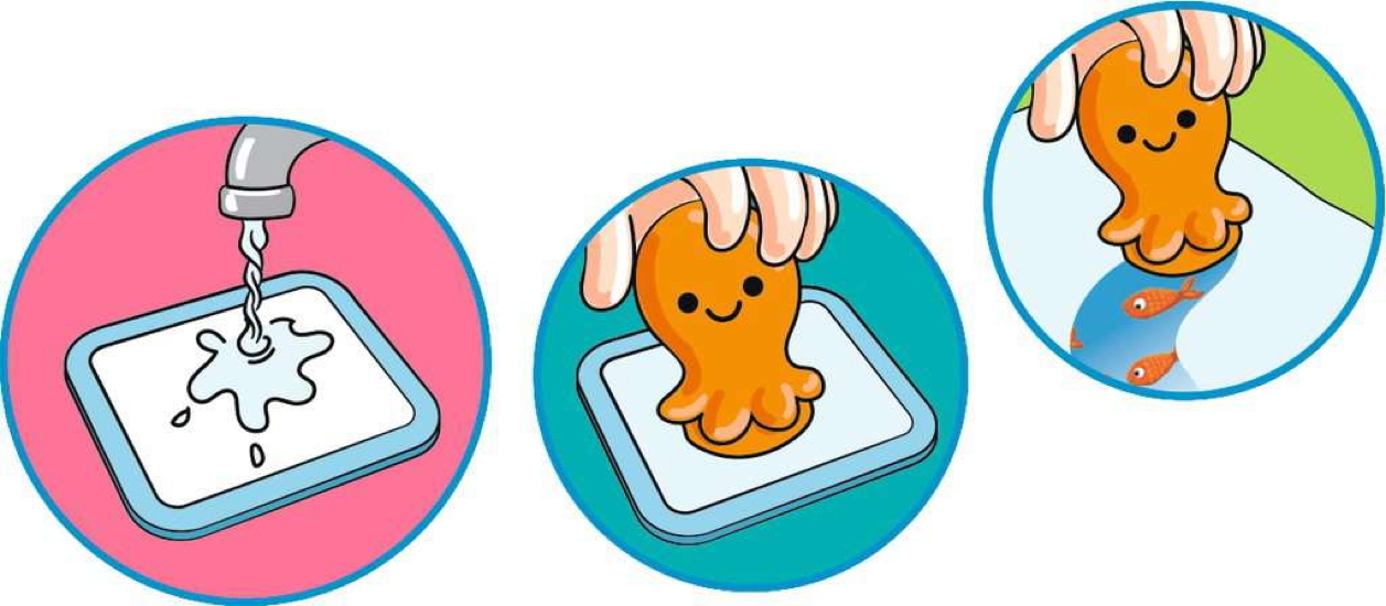 Das Geheimnis: In Kontakt mit Wasser wird die Oberfläche durchsichtig und gibt den Blick auf die Unterwasserwelt frei. Trocknet das Wasser, verschwinden die Bilder wieder. Für Extraspaß funktioniert das Stempeln sogar mit Babys Händchen und Füßchen