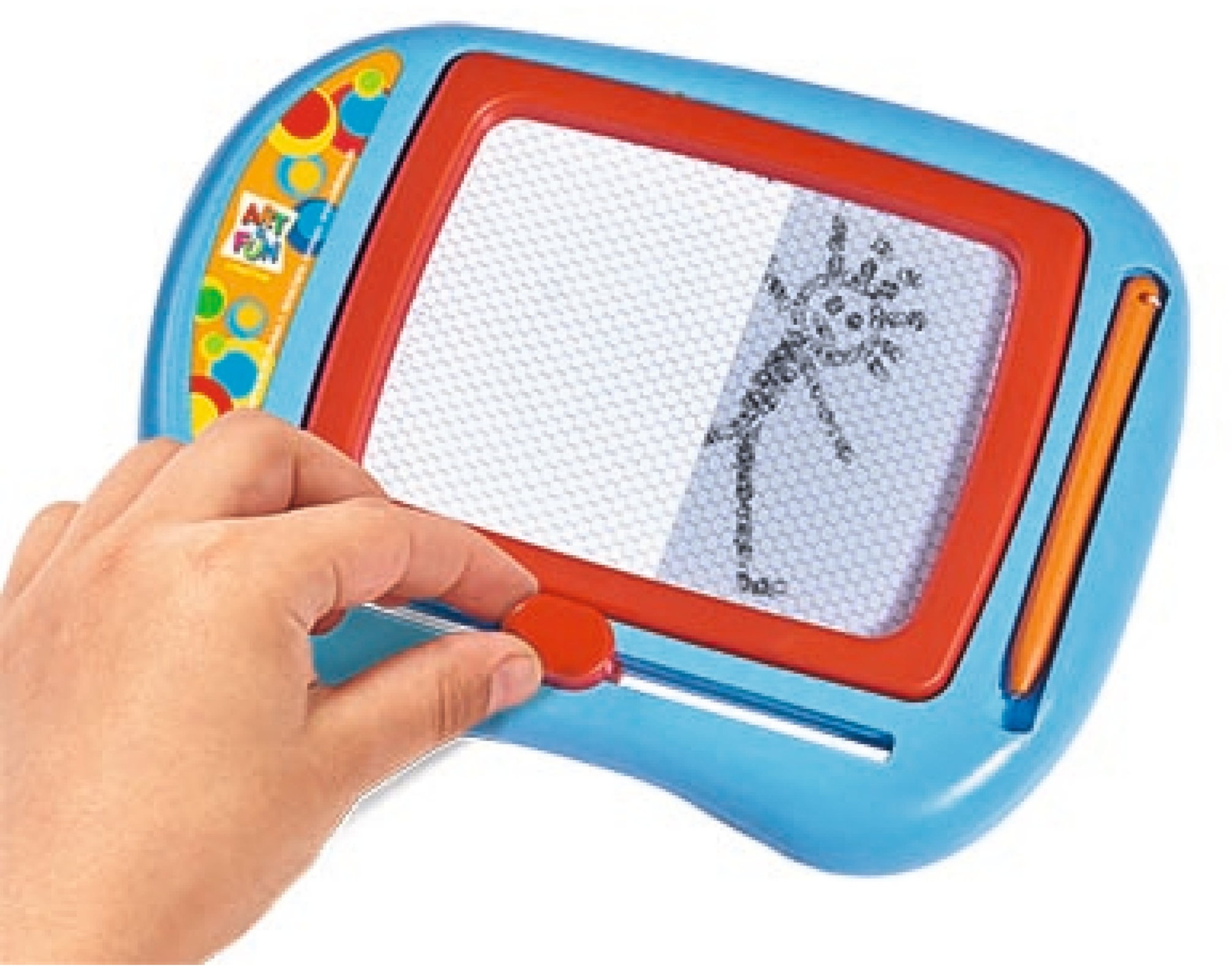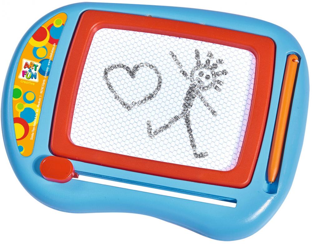 Die Art & Fun Kleine Zeichentafel für kreatives Malen ohne Papier. Mit dem Schieber kann das Gezeichnete immer wieder gelöscht und neu bemalt werden. Die Zeichentafel ist mit einem praktischen Tragegriff ausgestattet und kann überall mithin genommen werden. Die Art & Fun Kleine Zeichentafel ist für Kinder ab 3 Jahren geeignet.