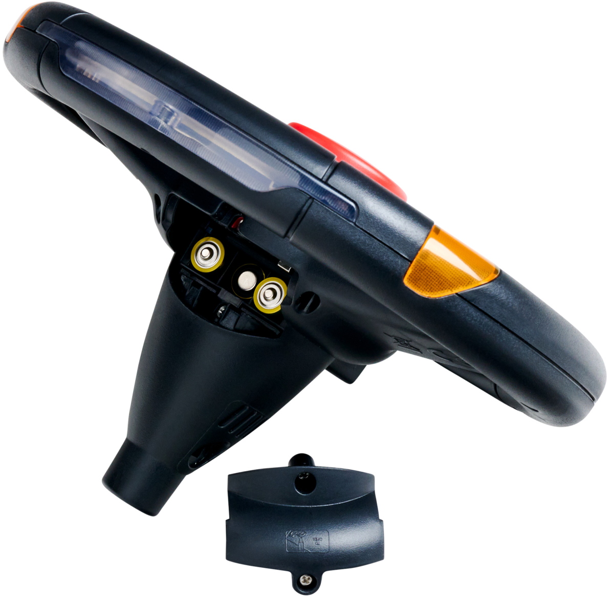 Das BIG Sound Lenkrad ist batteriebetrieben, die Batterien sind im Lieferumfang enthalten. Zur Schonung der Batterien schaltet sich das BIG Sound Lenkrad nach 2 Minuten ohne Tastendruck automatisch aus.