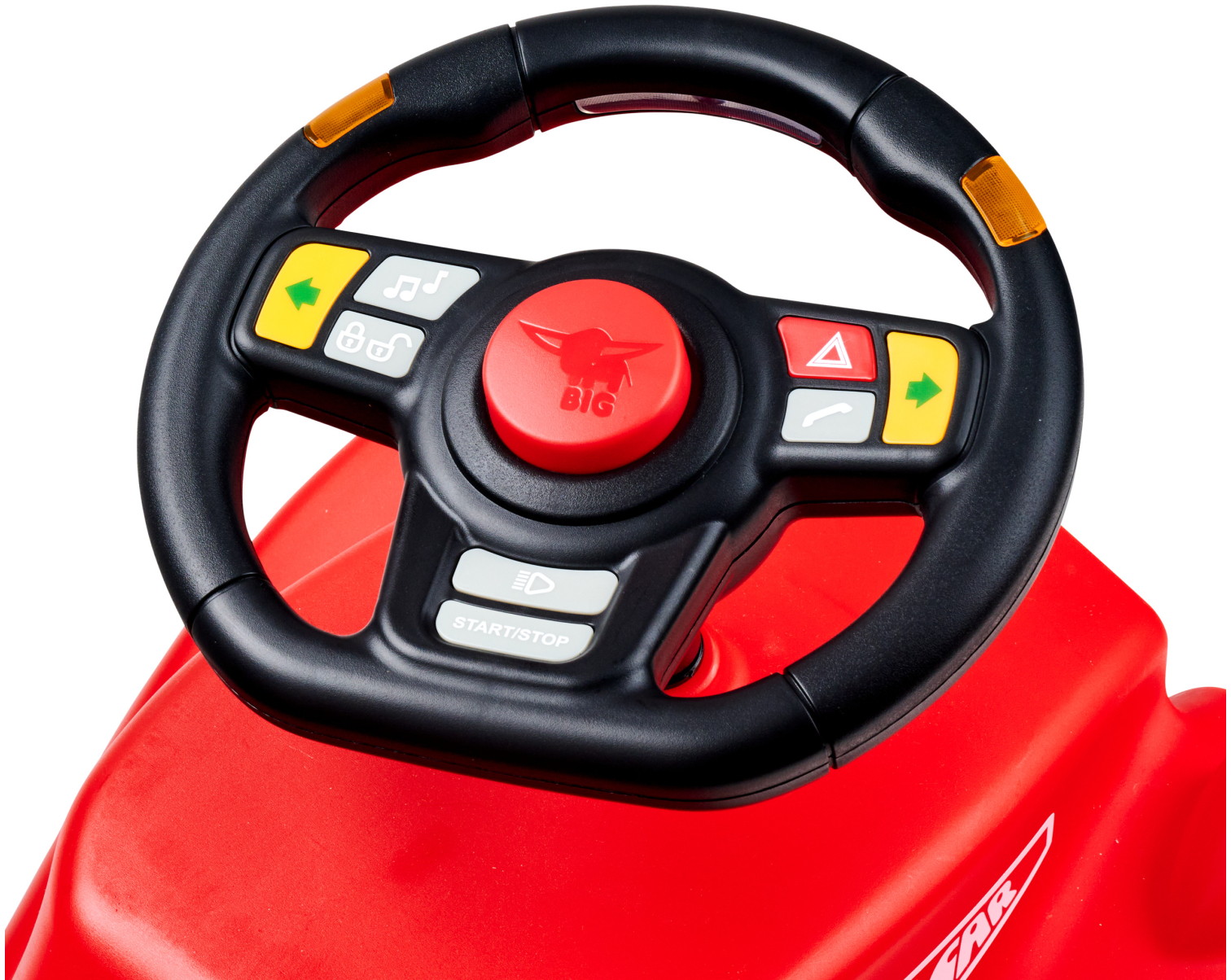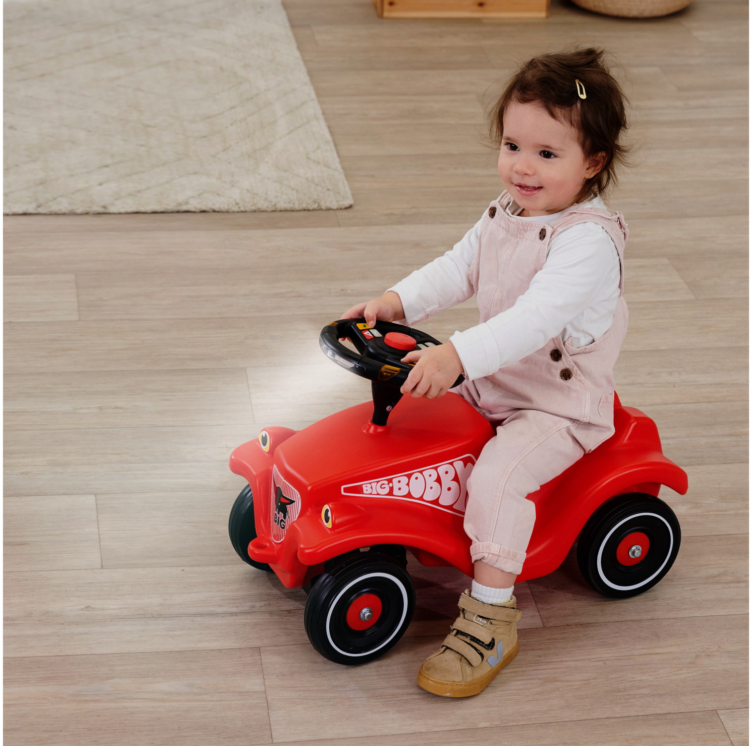 Gestartet wird durch Drücken der Start-/Stopp Taste. Ein originalgetreuer Motorensound begleitet die Kinder auf ihren ersten Metern. Sollten Hindernisse auftauchen, können die kleinen Fahrer und Fahrerinnen schnell durch Drücken der großen Hupentaste in der Mitte auf sich aufmerksam machen. Jeder Richtungswechsel wird durch Drücken der Blinkertasten rechts oder links angezeigt und wie bei den großen Originalen durch entsprechende Lichtsymbole begleitet. Damit die Fahrt nicht langweilig wird, versteckt sich hinter der Taste mit Noten das Autoradio mit fröhlichem Bobby Car Song. Sollte mal kein Parkplatz verfügbar sein und man nur schnell etwas ausladen müssen, wird einfach der Warnblinker betätigt. Das integrierte Autotelefon wählt im Handumdrehen die entsprechende Nummer, und falls die kleinen Fahrerinnen und Fahrer mal die Zeit vergessen und in der Dämmerung heimfahren müssen, verfügt das Lenkrad über einen großen LED Frontscheinwerfer. Nach Fahrtende wird das geliebte Bobby Car abgestellt und mit der Schlüsseltaste abgesperrt.