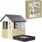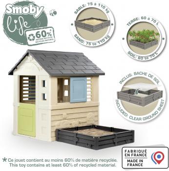 Smoby Life Spielhaus Square aus 60% Recyclingmaterial mit 2-in-1 Sandkasten + Pflanzbeet. Kleine Eingangstüre, 2 Fenster mit Lamellen und Schiebeläden und einem weiteren Fenster auf der Rückseite.
