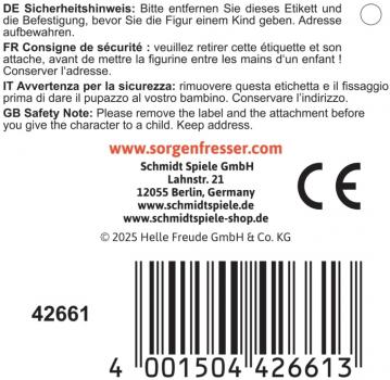 Sicherheitshinweis: Bitte entfernen Sie dieses Etikett und die Befestigung, bevor Sie die Figur einem Kind geben.