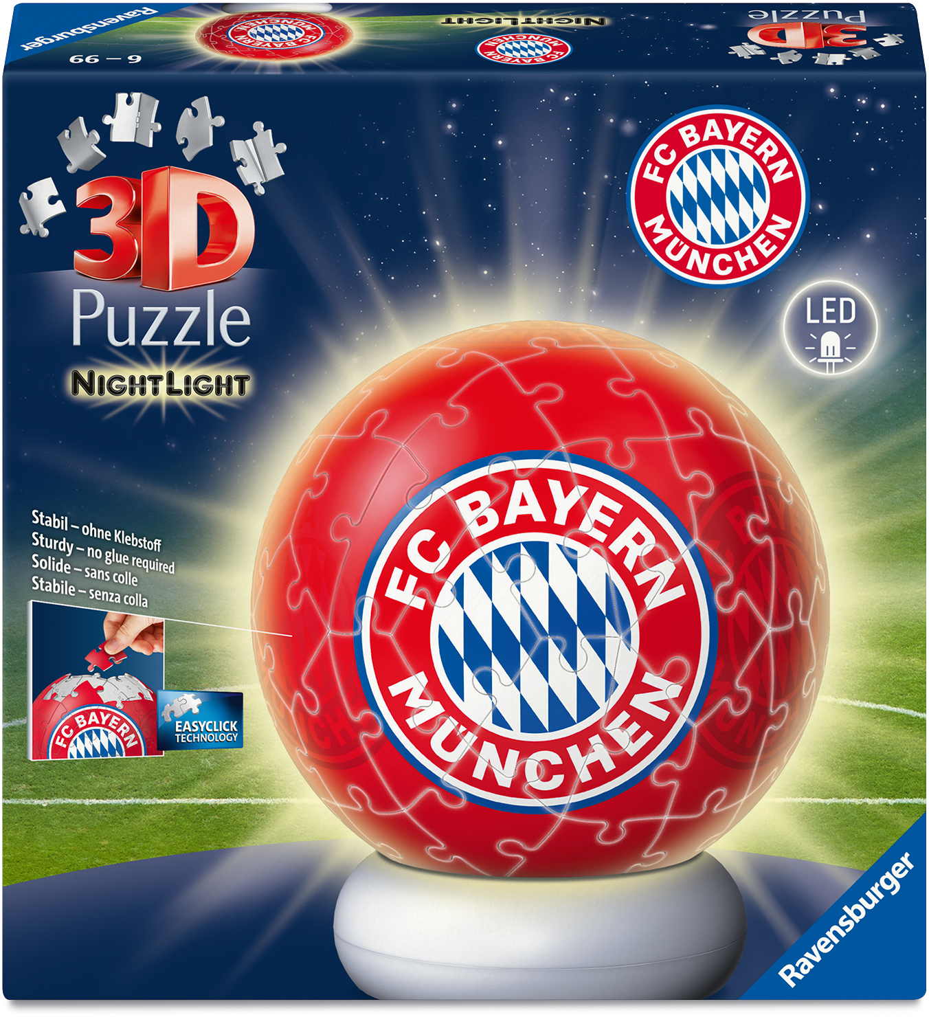 Für heldenhafte Träume – 3D Puzzle-Ball als dekoratives Nachtlicht im coolen DesignDas kickt! Dieser 3D Puzzle-Ball mit FC Bayern-Logo wird zur coolen Nachttischlampe, sobald der 2-stufig dimmbare Leuchtsockel den Ball von innen erstrahlen lässt.