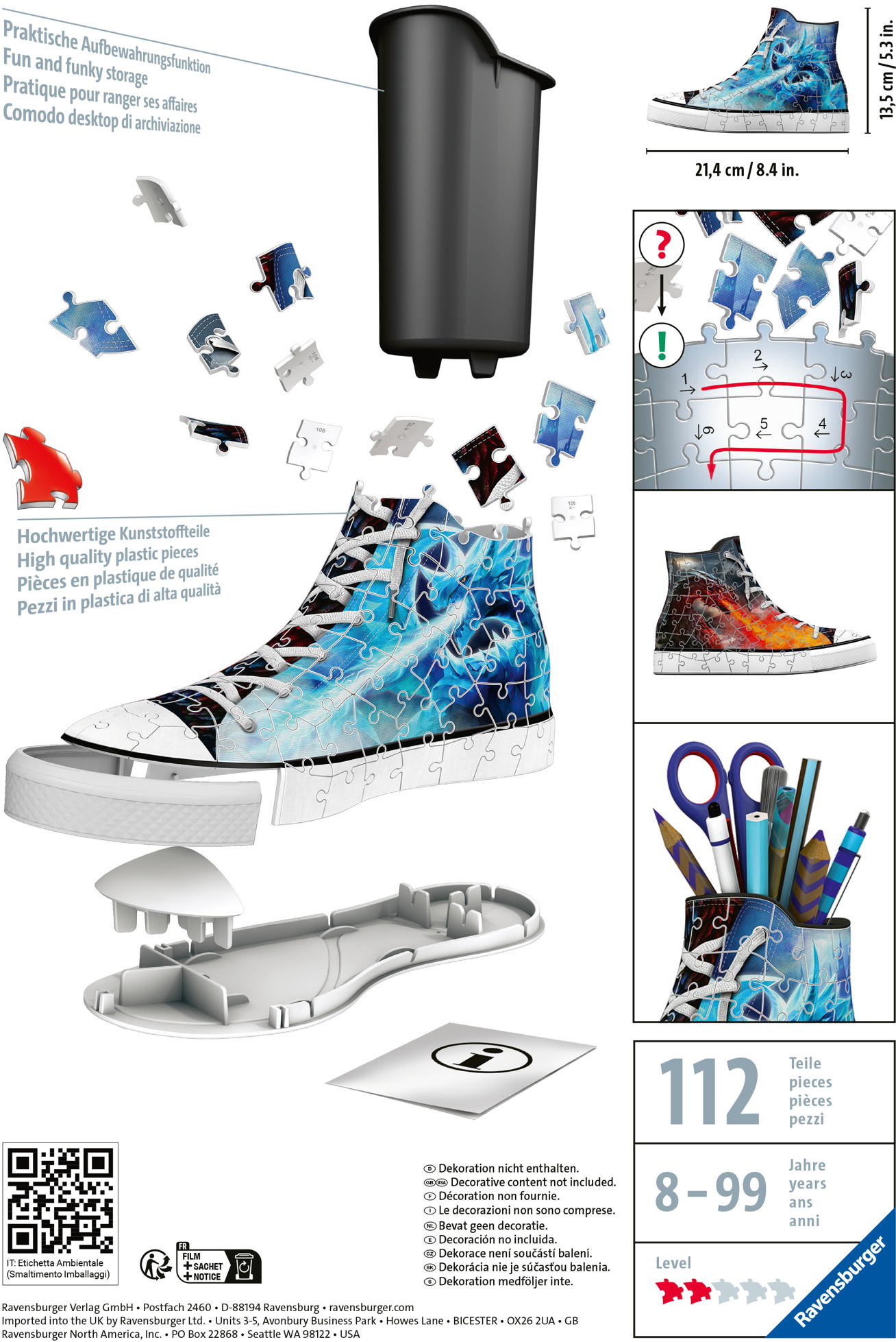 Sneaker sind angesagt! Und das nicht nur als trendiger Schuh, sondern auch in Form eines Ravensburger 3D Puzzles als coole Deko für das Kinderzimmer. Wer eine praktische Aufbewahrungsmöglichkeit für den Schreibtisch sucht, für den ist dieser 3D Puzzle-Sneaker genau das Richtige.Zuvor ist allerdings Puzzeln angesagt, denn die 108 Kunststoffteile wollen zusammengesetzt werden. Durch die Easyclick Technology passen die Teile ganz ohne Klebstoff präzise und stabil ineinander. Ein 3D Puzzle, das nicht nur Puzzlespaß bietet, sondern auch gute Dienste leistet: Denn die 108 nummerierten Kunststoff-Puzzleteile und die perfekt passenden Zubehörteile können zur praktischen Aufbewahrung genutzt werden - egal ob als Stiftebox, für Scheren oder anderen Krims-Krams. Dank der bebilderten Anleitung und den Zahlen auf der Rückseite der gewölbten Puzzleteile ist das Puzzeln des Organziers kinderleicht. Auch erwachsene Drachen-Fans haben Ihre Freude am Puzzeln und ein großartiges Dekoobjekt mit reichlich Platz für Utensilien aller Art.