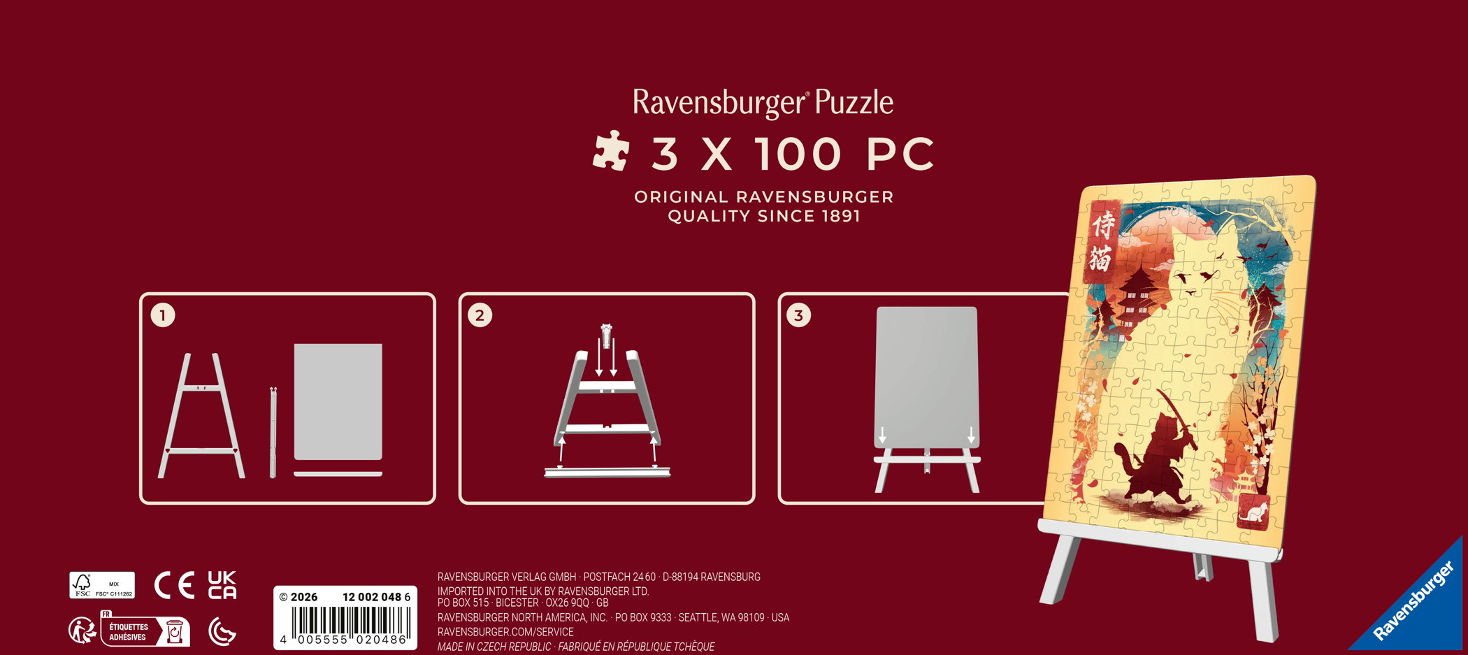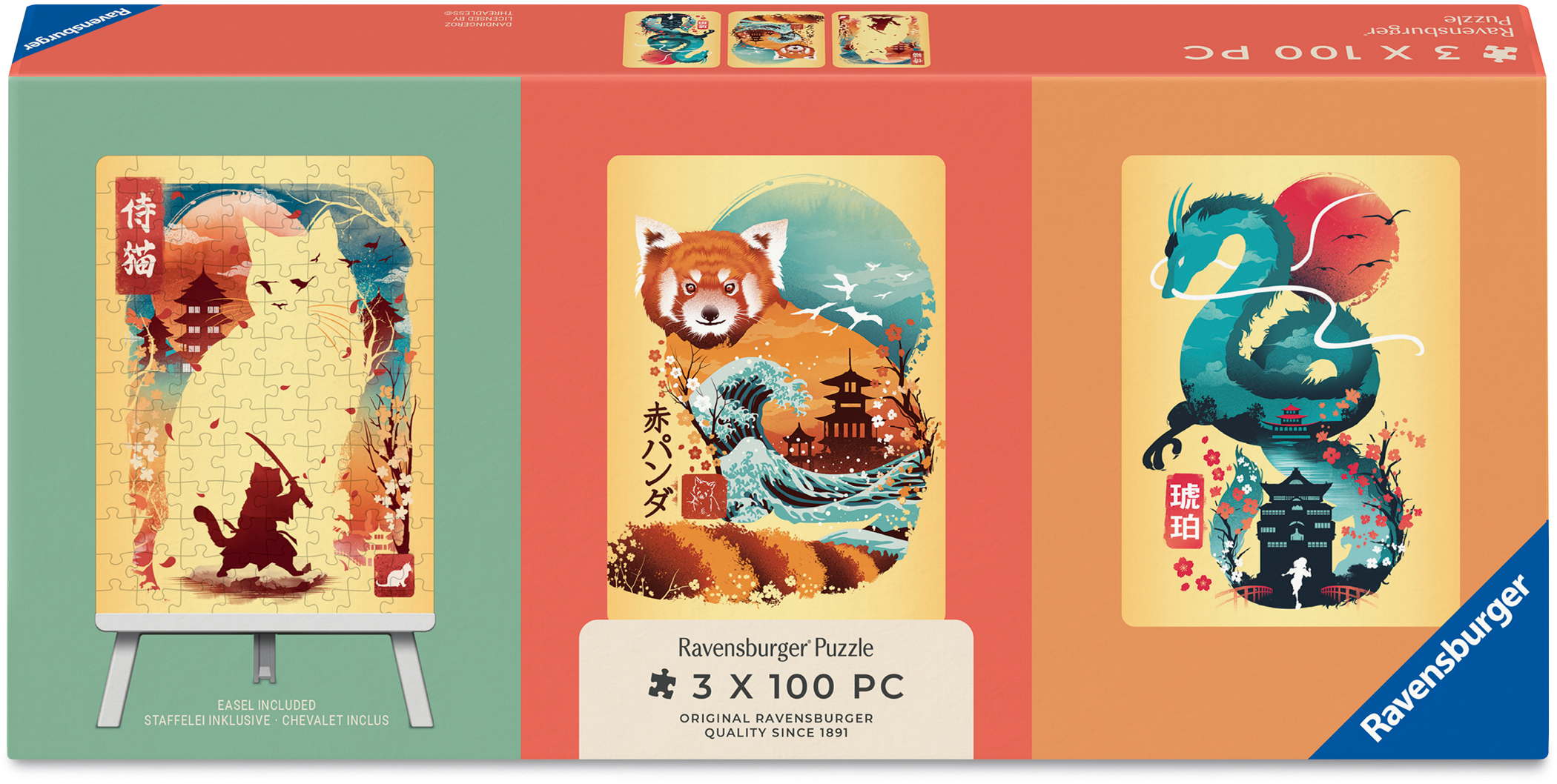 3 x 100 Teile Ravensburger Puzzle mit Staffelei Ukiyo-e Katzenkrieger, Roter Panda & Drache 12002048
