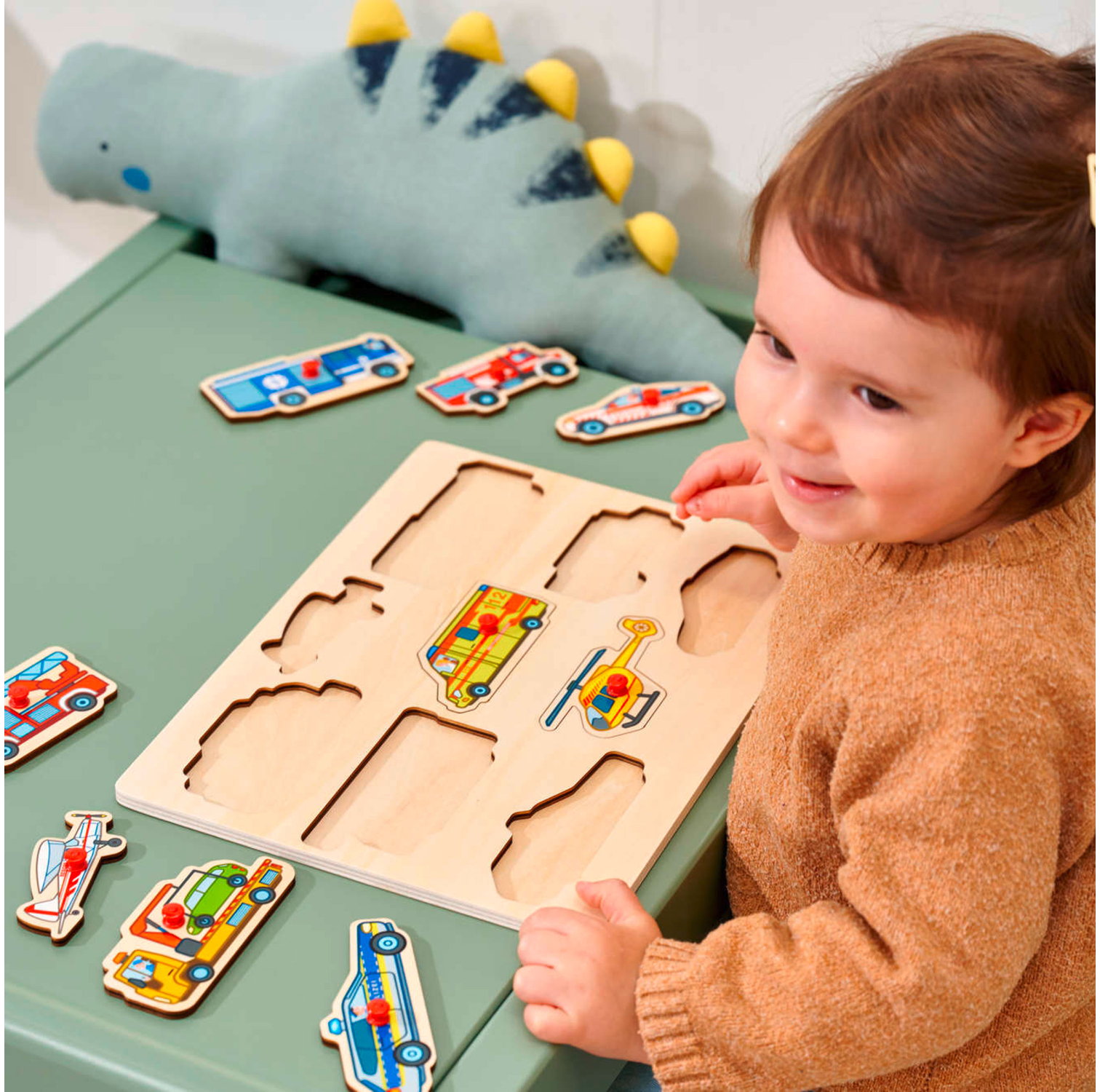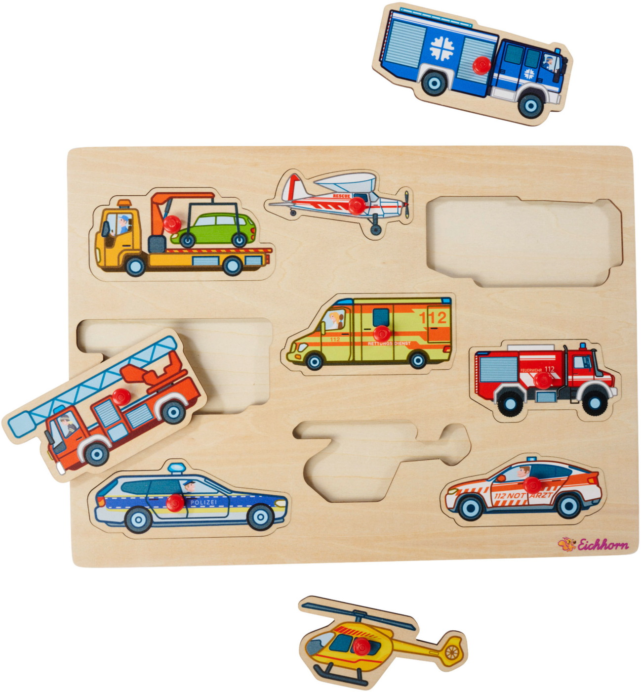 Entdecke das Eichhorn Einsatzfahrzeuge Holzpuzzle – das perfekte erste Puzzle für kleine Entdecker ab 1 Jahr! Mit liebevoll gestalteten Motiven wie Abschleppwagen, Feuerwehr, Polizei, Notarzt und Helikopter wird der Einstieg in die Welt des Puzzelns zu einem wahren Vergnügen. Die griffigen Pins ermöglichen es kleinen Händen, die Teile leicht zu greifen und sicher zu platzieren. Dieses Puzzle fördert spielerisch die Feinmotorik und Konzentration deines Kindes und besteht zu 100% aus FSC-zertifiziertem Holz – für unbedenklichen und nachhaltigen Spielspaß. Die einfache, kindgerechte Gestaltung macht es zum idealen Geschenk, sei es zum Geburtstag oder für gemeinsame Spielstunden. Verschenke Freude und unterstütze die Entwicklung deines Kindes.
