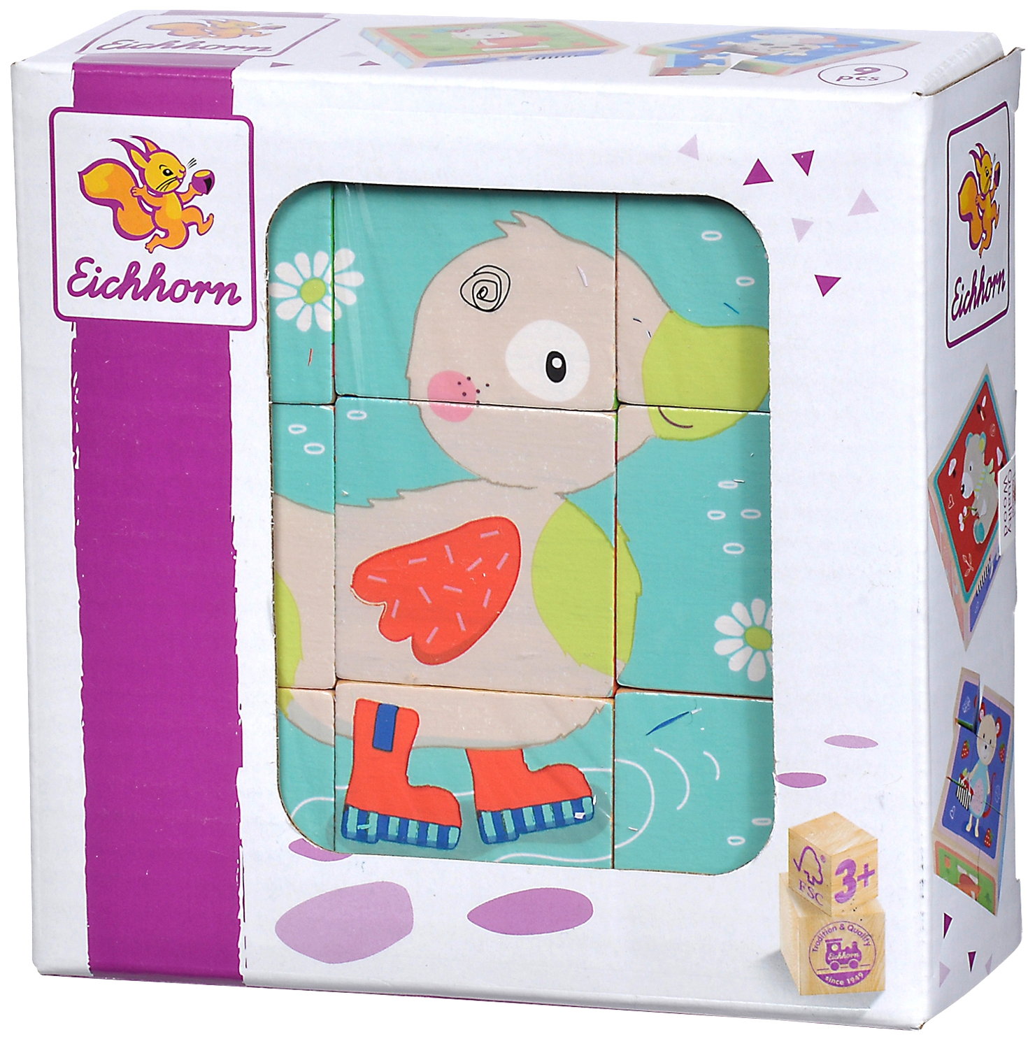 Je nachdem wie man die einzelnen Steine dreht entsteht mit dem Bilderwürfelpuzzle eines von sechs Tiermotiven. Mit Hilfe der Motivvorlagen werden die Steine mit der richtigen Seite darübergelegt. Das Puzzle besteht aus 9 Bausteinen aus Birkenholz und ist ca. 12 x 12 cm groß. Für die Herstellung der Eichhorn Bilderwürfel wird ausschließlich FSC® 100% Holz aus vorbildlicher Forstwirtschaft verwendet.