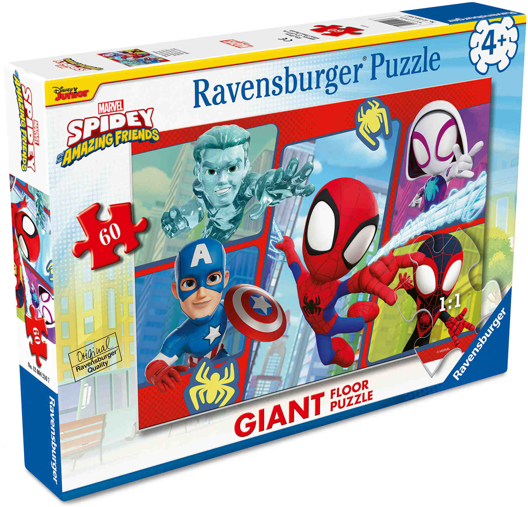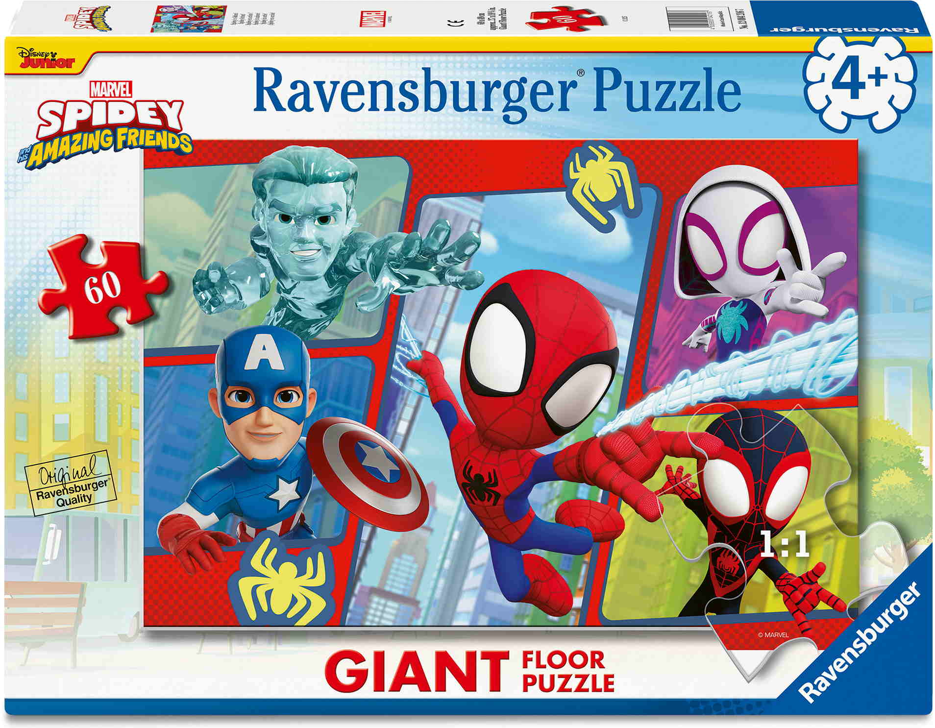 Ravensburger Giant Floor Puzzles – Puzzlespaß im Großformat! Aus 60 extra großen und stabilen Puzzleteilen entsteht ein tolles, farbenfrohes Motiv mit dem beliebten Marvel Superheld "Spidey. Stück für Stück können Kinder ab 4 Jahren in Spideys fantastische Welte eintauchen und dabei spielerisch Konzentration und Feinmotorik trainieren.