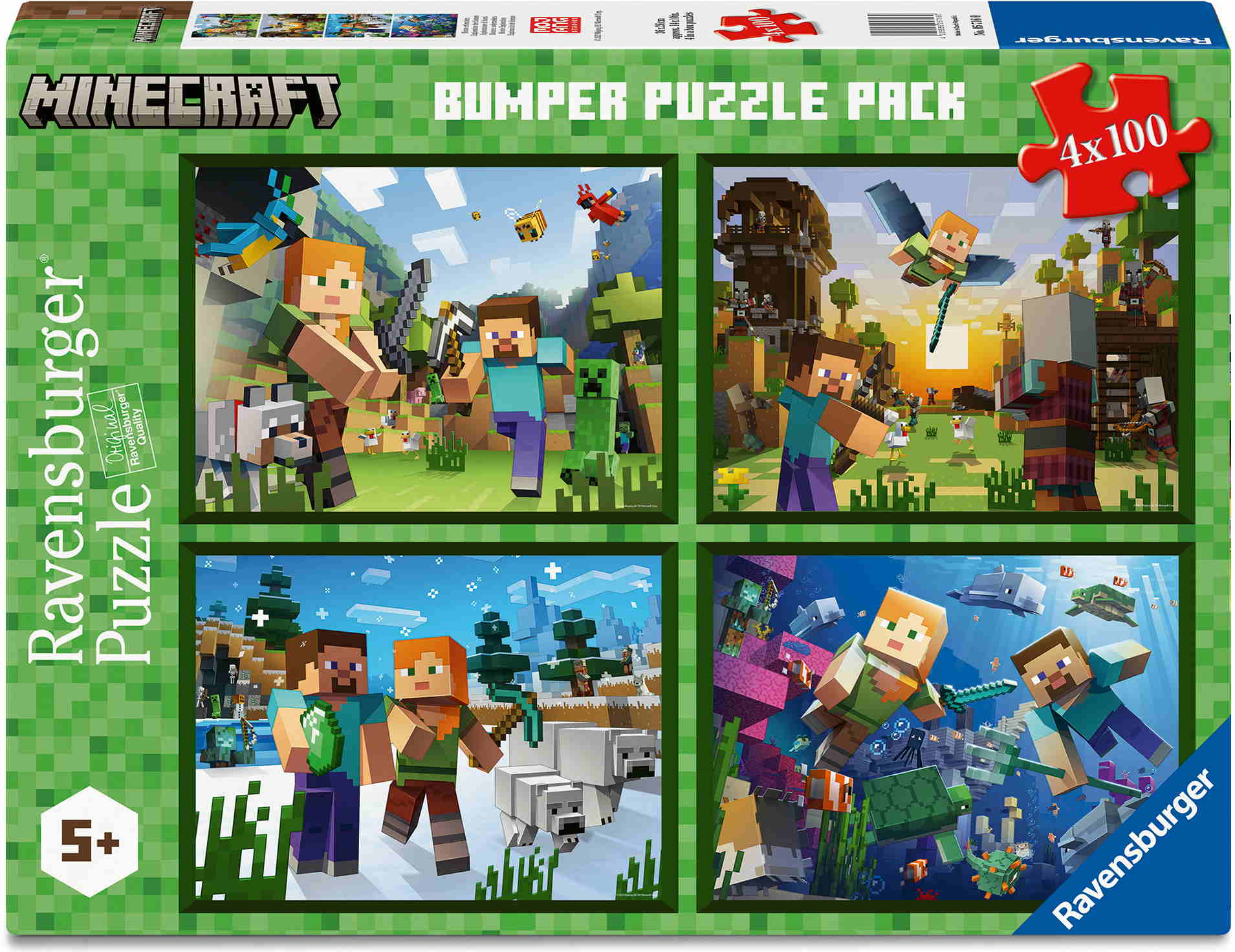 Hier steckt mehr drin! 4 Puzzles mit jeweils 100 Teilen: Vierfacher Puzzlespaß für Kinder ab 5 Jahren. Unsere Puzzles werden in exzellenter Verarbeitungsqualität mit Material aus nachhaltiger Forstwirtschaft gefertigt. Stück für Stück entstehen 4 bunte Motive aus dem bekannten Game "Minecraft".