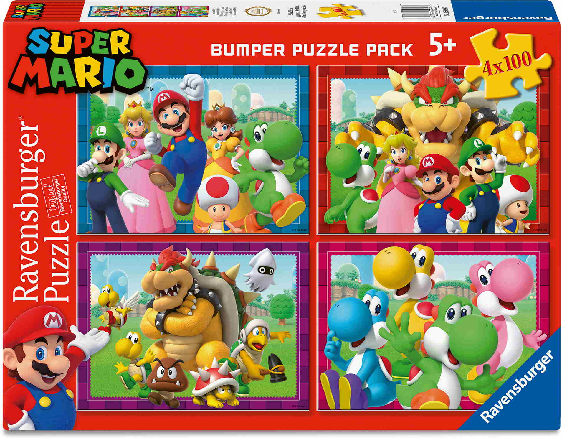 Hier steckt mehr drin! 4 Puzzles mit jeweils 100 Teilen: Vierfacher Puzzlespaß für Kinder ab 5 Jahren. Unsere Puzzles werden in exzellenter Verarbeitungsqualität mit Material aus nachhaltiger Forstwirtschaft gefertigt. Stück für Stück entstehen 4 farbenfrohe Motive mit Super Mario und den beliebtesten Figuren aus dem gleichnamigen Nintendo-Spiel.
