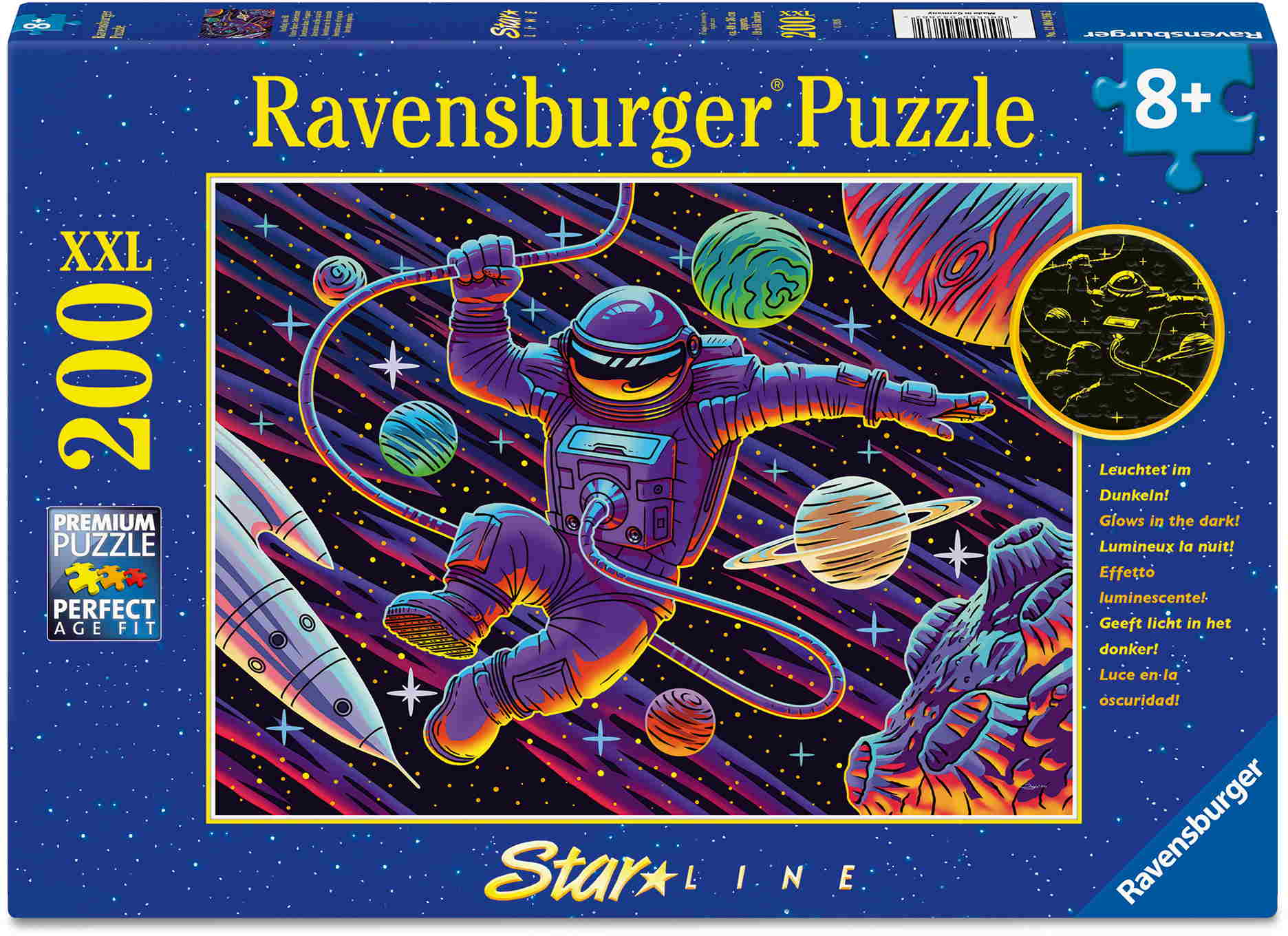 Im Kinderzimmer wird es dunkel... Jedoch nicht ganz! Denn das Star Line Puzzle mit Leuchtfarbe verbreitet einen magischen Schein, selbst wenn das Licht schon längst erloschen ist. Zusätzliche Leuchtfarbe auf der Oberfläche lässt das Motiv hell erstrahlen. Mit 200 Teilen im XXL-Format sind sie ideal geeignet für Kinder ab 8 Jahren. Mit den Ravensburger Glue Sheets fixiert, lassen sich die Star Line Leuchtpuzzles ganz einfach aufhängen und geleiten die kleinen Puzzler und Puzzlerinnen Nacht für Nacht ins Land der Träume. Die Motive wurden speziell für den Leuchteffekte entwickelt. Die Auswahl der richtigen Motive und die hohe Qualität unserer Kinderpuzzles liegen uns sehr am Herzen. Deshalb wird die Unbedenklichkeit aller Materialien sowie der phosphoreszierenden Leuchtfarbe von einem unabhängigen Institut bestätigt. Seit mehr als 100 Jahren entwickeln wir Puzzles, wie Kinder sie lieben: altersgerecht in Motiv, Teilezahl und -größe. Hinweis: Für die volle Leuchtkraft das Puzzle eine Minute mit einer hellen Lichtquelle anstrahlen. Der maximale Leuchteffekt dauert ein paar Minuten an und lässt dann langsam nach.