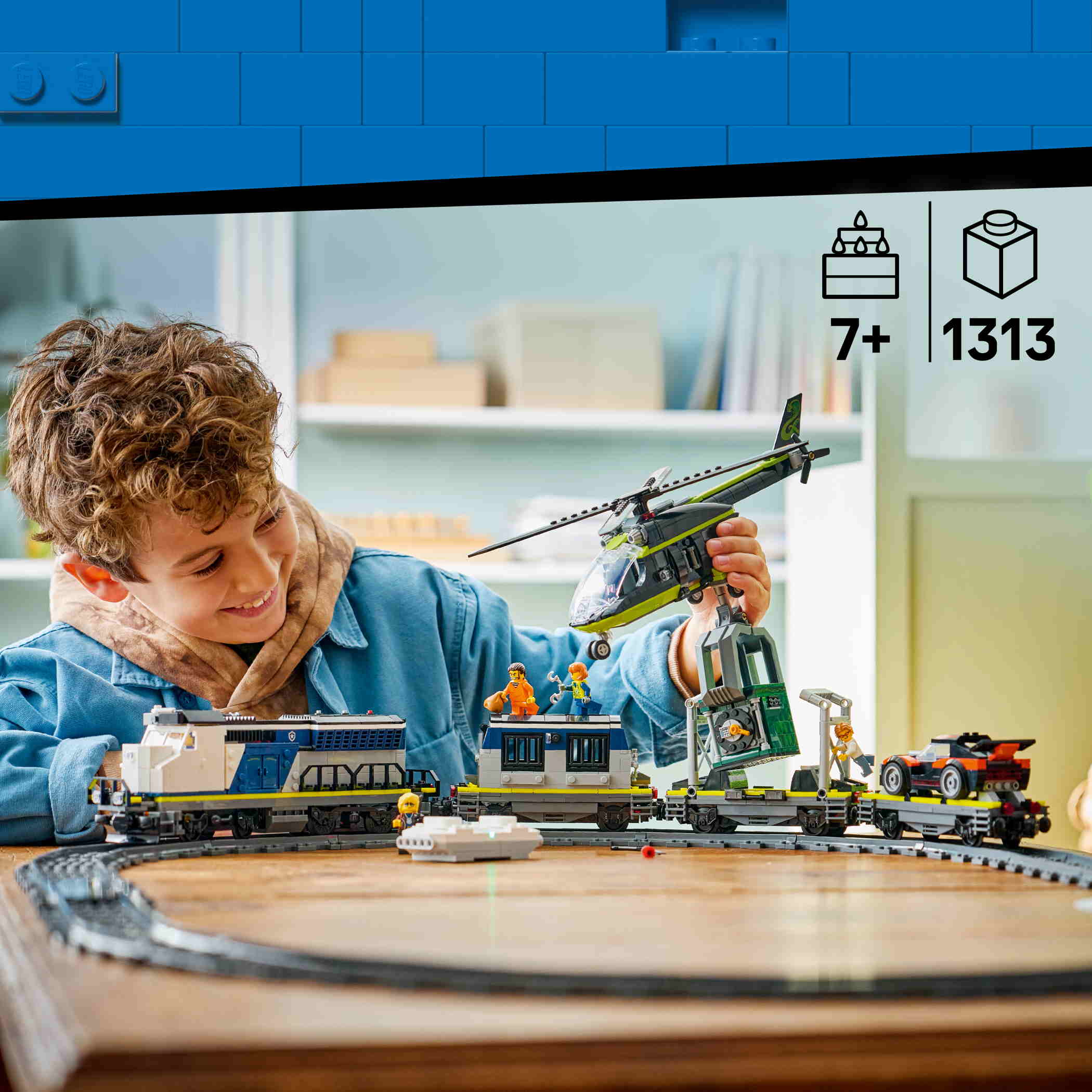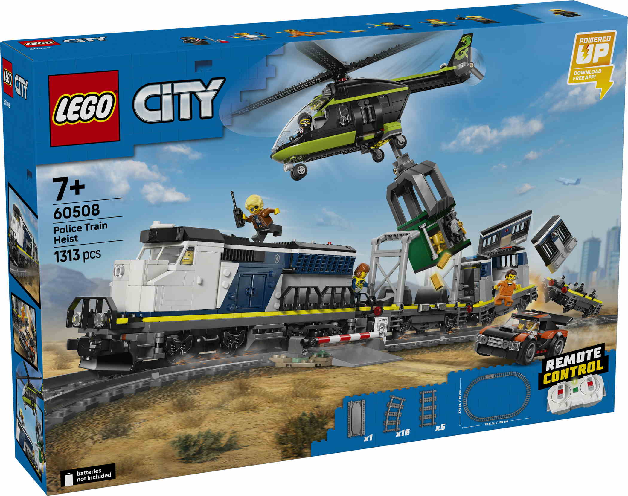 - LEGO® City Überfall auf den Polizeizug (60508) ist ein Spielset, das Kindern ab 7 Jahren stundenlang jede Menge Actionspaß bietet. Dieses Set mit Powered Up-Elektrozug beinhaltet eine funktionierende Lok und 3 Flachwagen mit Gefängniszelle, Banktresor und Rallyeauto. Zum Set gehören auch eine ovale Eisenbahnstrecke mit Bahnübergang und ein Schienenstück, um Züge entgleisen zu lassen. Der Hubschrauber mit funktionierender Greifklaue und 6 Minifiguren lassen Kinder fantasievolle Abenteuer und Überfälle auf den Zug darstellen.Dieser Spielzeugzug ist ein tolles Überraschungs- oder Geburtstagsgeschenk für Kinder ab 7 Jahren, die Modelleisenbahnen und LEGO Bausets lieben. Für noch spannendere Abenteuer können Kinder dieses Set mit anderen separat erhältlichen LEGO City Modellen kombinieren.Zu diesem LEGO City Spielset ist in der LEGO Builder App auch eine 3D-Bauanleitung für ein intuitives Bauerlebnis verfügbar. In der App können Kinder 3D-Modelle vergrößern und drehen und sich anschauen, wie weit sie schon sind. Das Set besteht aus 1.313 Teilen.
