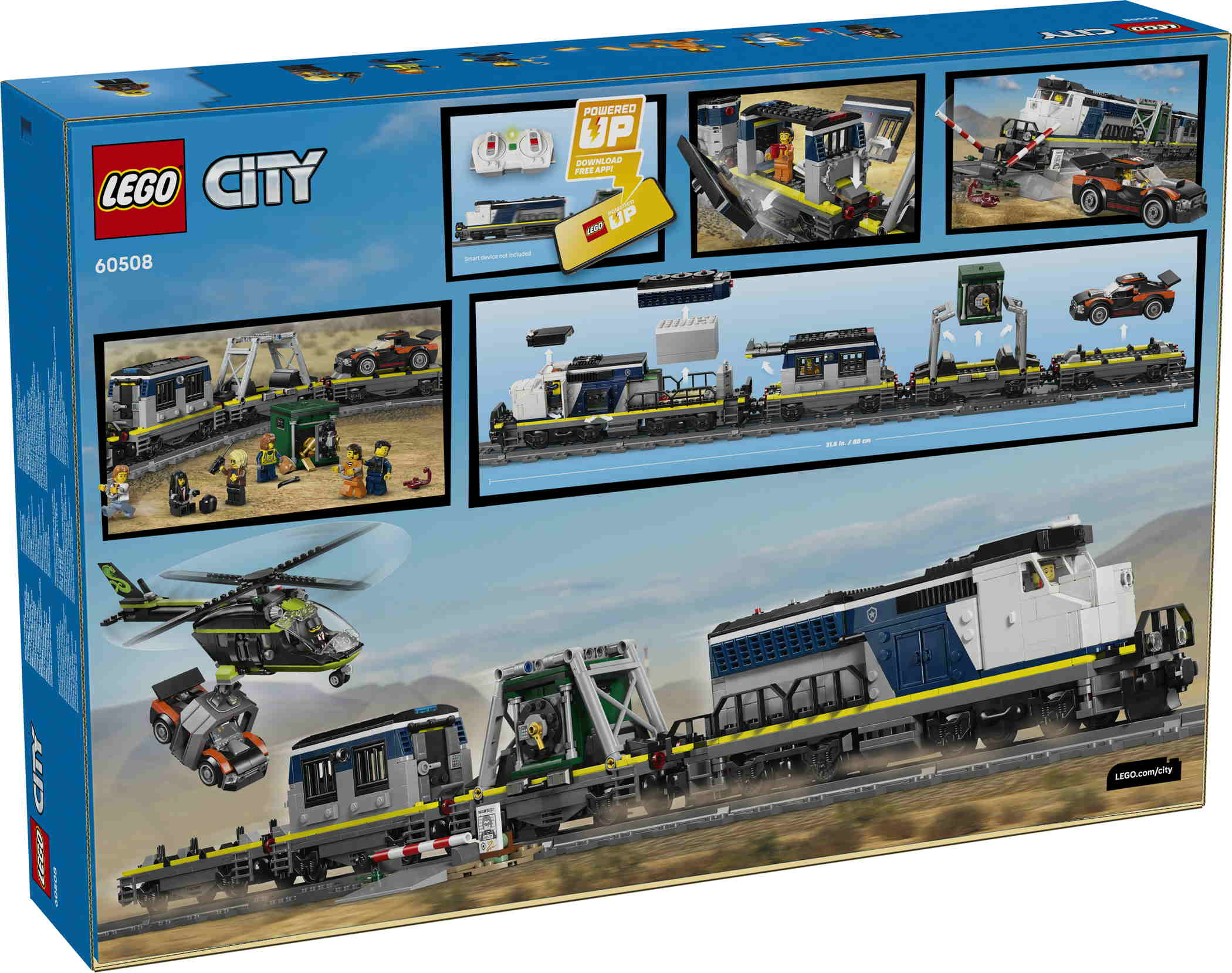 - INHALT DER BOX: In diesem Spielset ist alles vorhanden, was Kinder brauchen, um eine Powered Up-Lok, 3 Flachwagen, ein Rallyeauto, einen Hubschrauber, eine Gefängniszelle, einen Banktresor, einen Bahnübergang und 6 Minifiguren zu bauen