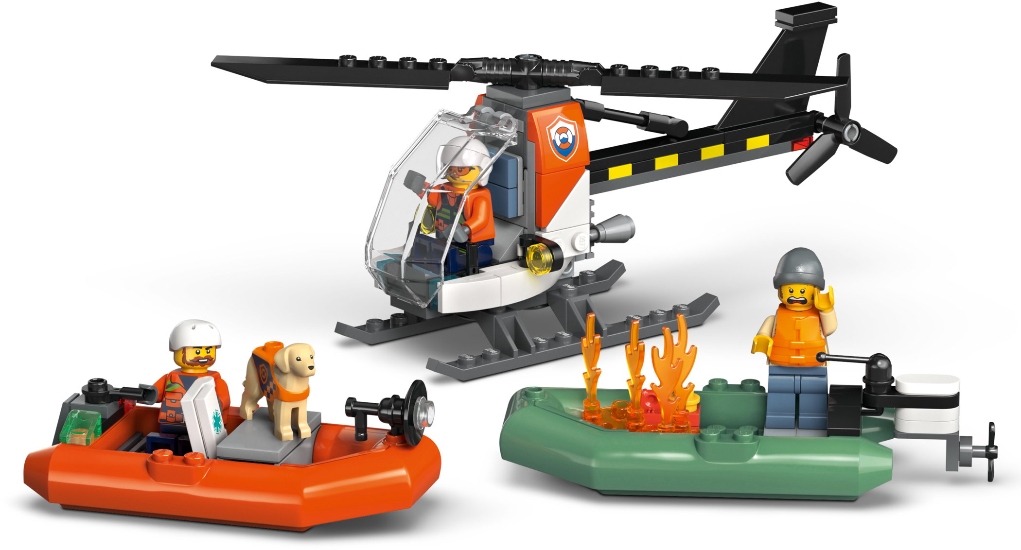 - INHALT DER BOX: Alles, was Kinder brauchen, um ein schwimmendes LEGO® Küstenwachboot, einen Spielzeughubschrauber und 2 schwimmende Schlauchboote sowie 5 Minifiguren und einen Hund zu bauen
