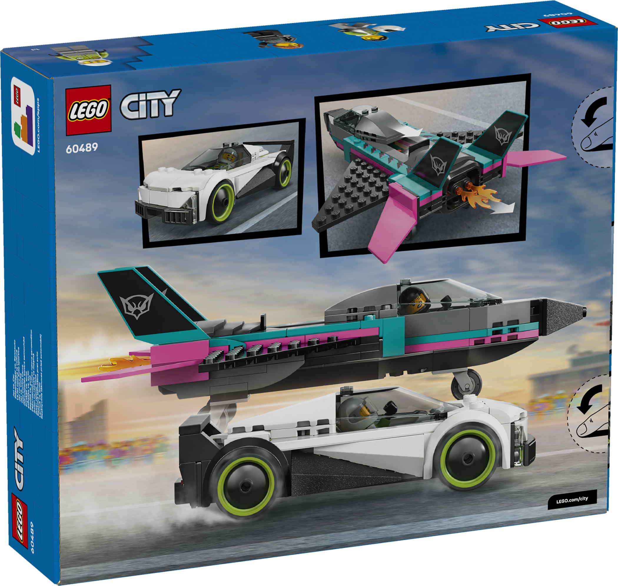 - LEGO® City Düsenflieger vs. Rennauto (60489) ist ein Spielset mit einem windschnittigen Supersportwagen und einem Überschalljet für fantasievolle Rennen. Der Spielzeugjet hat rückwärts gepfeilte Flügel und zwei senkrechte Leitwerke und Stabilisatoren. Kinder können einen Hebel schieben, um die Nachbrenner des Jets zu zünden. Wenn sie das Cockpit des Supersportwagens öffnen, erhalten sie Zugang zum detailgetreuen Innenraum mit Rennsitz. Zwei Minifiguren steuern das Flugzeug und den Flitzer bei den spannenden Rennen.Der Düsenflieger und das Rennauto aus diesem Bauset bieten jeden Tag riesigen Spielspaß. Das Set ist ein tolles Geschenk für Kinder ab 6 Jahren, die Spielzeugrennautos und Modellflugzeuge lieben. Für noch mehr Actionspaß in der Stadt können Kinder dieses Set mit anderen separat erhältlichen LEGO City Modellen kombinieren.Noch mehr Bauspaß mit dem Sportwagen und dem Düsenflieger aus diesem LEGO Spielset bietet die LEGO Builder App. In der App können Kinder 3D-Modelle vergrößern und drehen und sich anschauen, wie weit sie schon sind. Das Set besteht aus 259 Teilen.