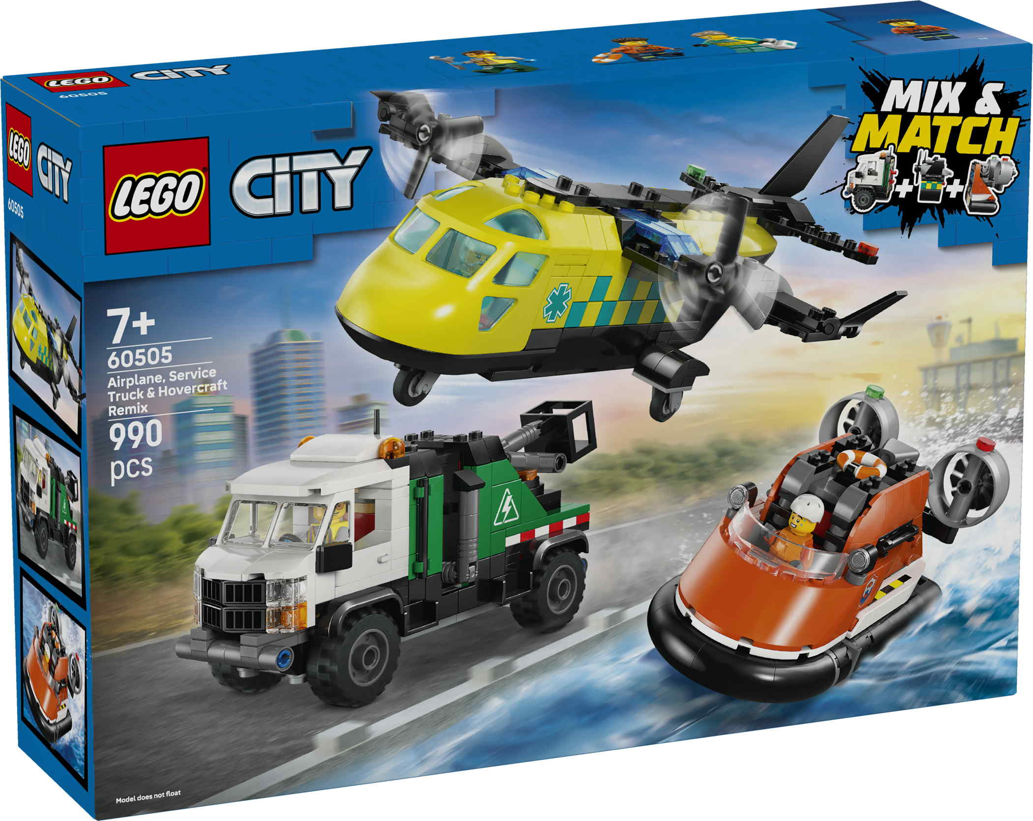 - Das LEGO® City Kombinationsset mit Flugzeug, Wartungsfahrzeug und Luftkissenboot (60505) lässt Kinder ab 7 Jahren besonders kreativ spielen. Dieses Bauset beinhaltet 3 Modelle von Rettungsfahrzeugen: ein Rettungsflugzeug, ein Luftkissenboot der Küstenwache und ein Wartungsfahrzeug mit Hubarbeitsbühne. Jedes Modell besteht aus 3 kombinierbaren Modulen, die Kinder zu verschiedenen Einsatzfahrzeugen für viele Actionmissionen anders zusammenfügen können. 3 Minifiguren (eine fährt das Wartungsfahrzeug, eine ist bei der Küstenwache und eine ist Sani) laden zu spannenden Abenteuern ein.Dieses Spielset mit 3 Einsatzfahrzeugen ist ein tolles Überraschungs- oder Geburtstagsgeschenk für Kinder, die interaktives Spielzeug lieben und gerne fantasievoll spielen. Für noch spannendere Abenteuer können Kinder dieses Set mit anderen separat erhältlichen LEGO City Modellen kombinieren.Die LEGO Builder App bietet ein intuitives Bauerlebnis mit dem Flugzeug, dem Luftkissenboot und dem LKW aus diesem Bauset. Die 3D-Bauanleitung lässt Kinder die Modelle vergrößern und drehen. Und in der App kann man sich auch ansehen und speichern, wie weit man mit den Modellen schon ist. Das Set besteht aus 990 Teilen.