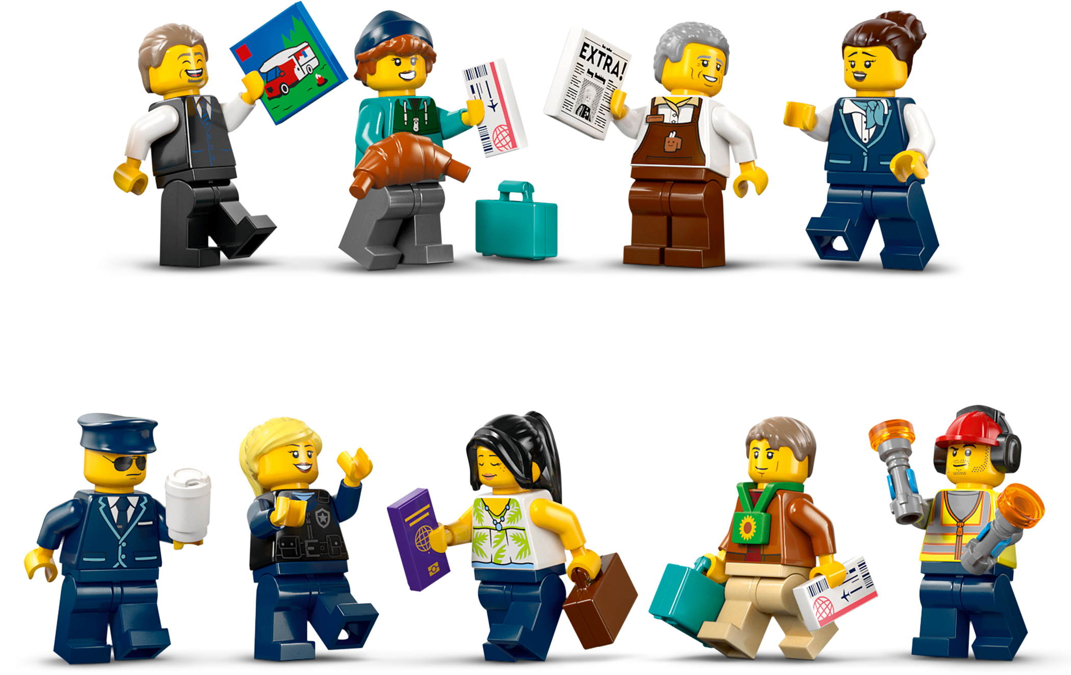 - LEGO® MINIFIGUR-ZUBEHÖR: 3 Koffer, 2 Bordkarten, Einwinkstäbe, ein Sonnenblumenumhängeband, ein Reisepass, eine Zeitung, eine Karte und ein Croissant vervollständigen das Spielset