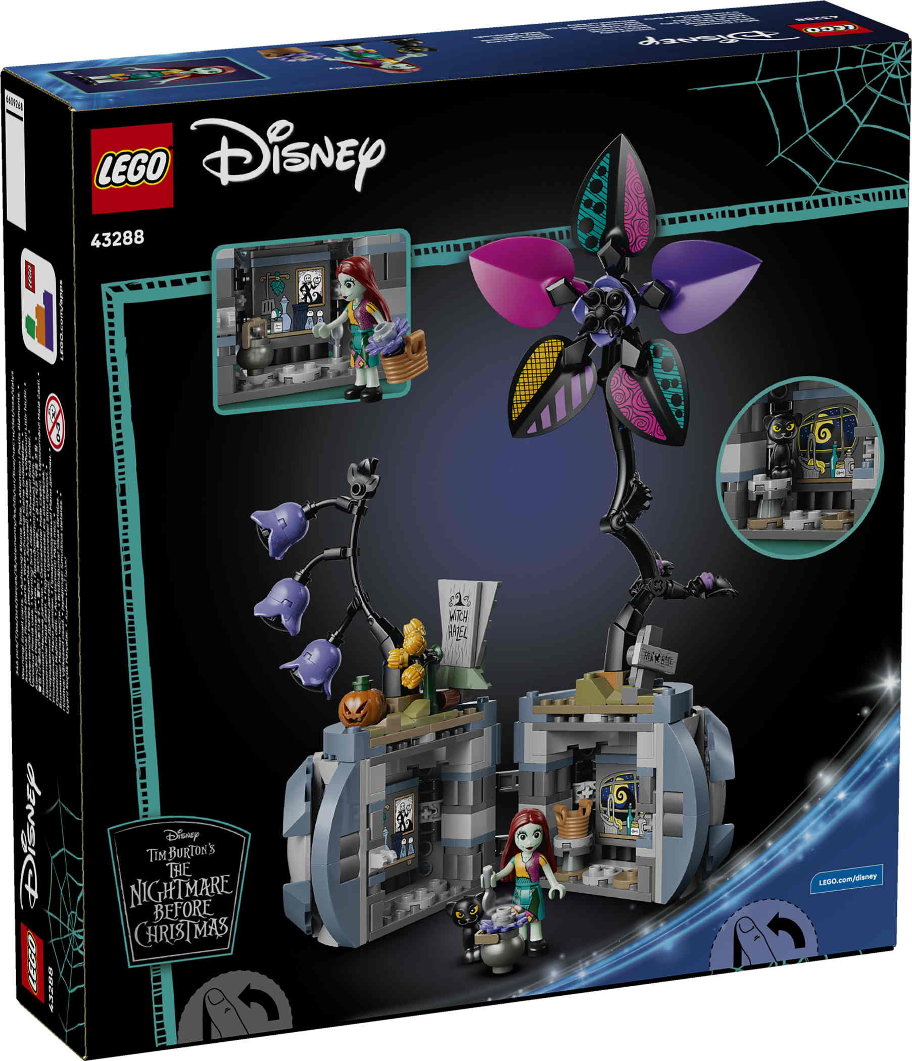 - LEGO® ǀ Disney Sallys Blumentopf (43288) hält viele Überraschungen für Kinder ab 9 Jahren bereit. Dieses Bauset zu Tim Burtons The Nightmare Before Christmas enthält 2 LEGO ǀ Disney Figuren: Sally und ein schwarzes Kätzchen laden zum Spielen ein. Auch ein Blumentopf, 2 Blumen aus LEGO Steinen, versteckte Räume und Grafikaufkleber am und im Topf bieten jede Menge Spielspaß. Innen befinden sich unter anderem ein Korb, ein Kessel und ein baubarer Tisch. Nach dem Spielen können die beiden Figuren sicher im Blumentopf aufbewahrt werden.Dieses Bauspielzeug ist ein cooles Geburtstags- oder Weihnachtsgeschenk für Kinder ab 9 Jahren. Stell diesen Blumentopf zusammen mit anderen separat erhältlichen LEGO ǀ Disney Bauspielzeugen aus, um allen deine Sammlung zu zeigen. Dieses Modell bietet jede Menge tolle Möglichkeiten, Kinder fantasievoll spielen zu lassen.Die verständlichen digitalen Bauanleitungen in der LEGO Builder App lassen Kinder selbstbewusst bauen. Baufans können in der App 3D-Modelle betrachten und sich anschauen, wie weit sie mit ihrem Modell schon sind. Das Set besteht aus 346 Teilen.