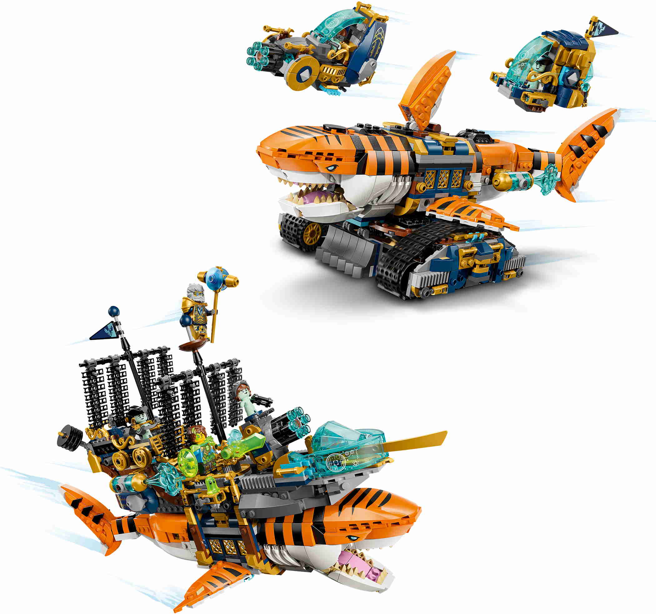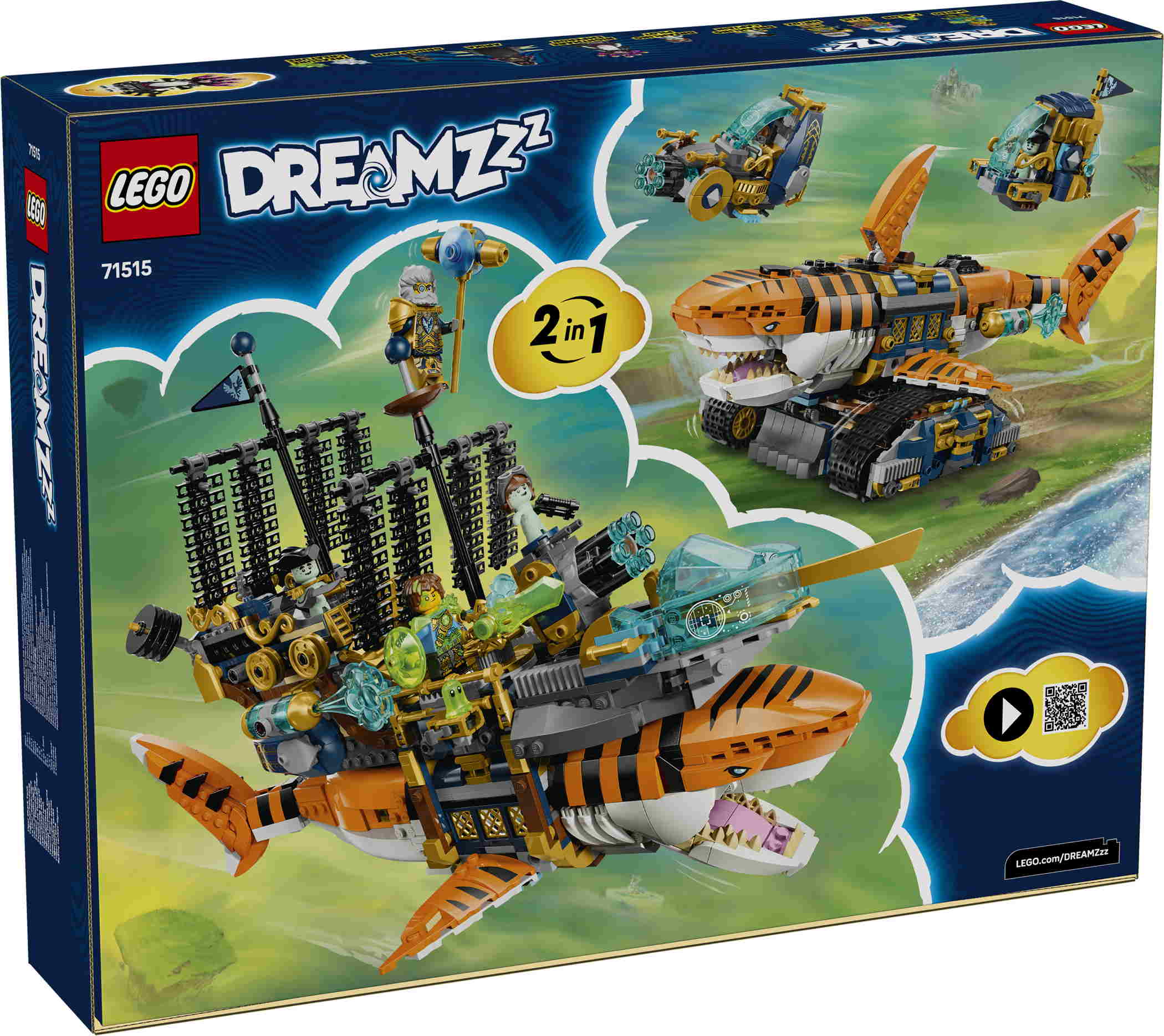- Das LEGO® DREAMZzz™ Tigerhai-Fahrzeug (71515) lässt Kinder ab 9 Jahren besonders fantasievoll bauen und spielen. Das Set bietet 2 Bauoptionen. Kinder können entweder ein Tigerhai-Fahrzeug oder ein Tigerhai-Schiff bauen.Das Tigerhai-Fahrzeug hat ein aufklappbares Maul, einen beweglichen Schwanz, 2 seitliche Kapseln mit Shootern, Stauraum und Platz für eine Minifigur am Steuer. Das Tigerhai-Schiff hat eine Bugkanone, seitliche Shooter, ein aufklappbares Maul, Platz für Schätze im Heck und einen Anker. Die Minifiguren Mateo, Izzie, Mr. Oz, der Albtraumkaiser und Arika schwingen Schwerter zum Sammeln und laden zu vielen Rollenspielen ein. Auch ein Diamant-Ei, eine Grüne und eine Weiße Schatzkreatur, Z-Blob, ein Albgnom, 2 Träumlinge und 3 Spinnen gehören zu dem Spielset.Das Tigerhai-Fahrzeug ist ein tolles Geburtstagsgeschenk für Kinder. Bauanleitungen in Form einer Bildergeschichte erwecken die Modelle zum Leben und bieten den Baufans packenden Actionspaß. Eine digitale Version dieser Anleitungen ist auch in der LEGO Builder App verfügbar. Das Set besteht aus 1.548 Teilen.