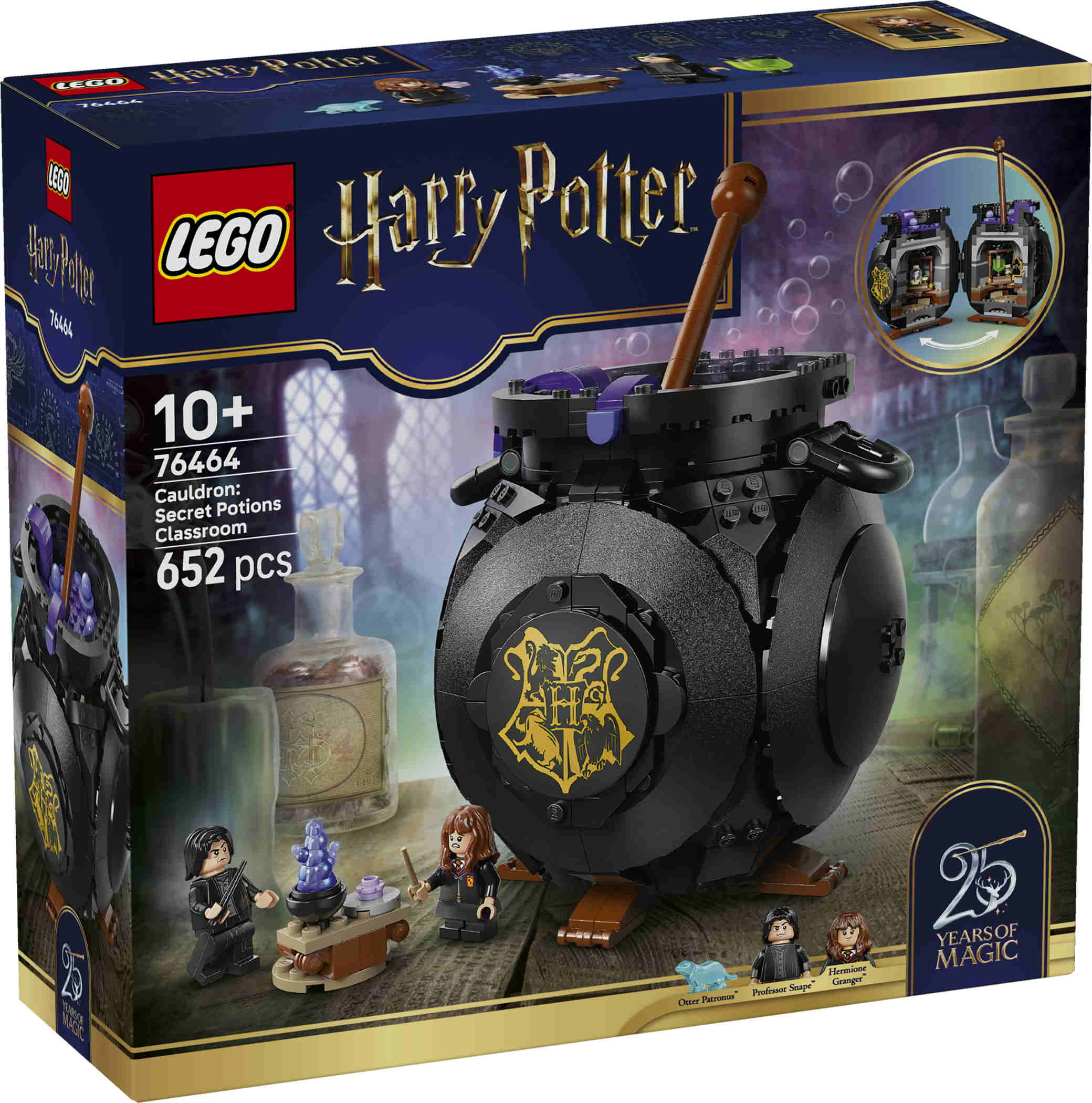 - LEGO® Harry Potter™ Set (76464) zum Bauen, Spielen und Ausstellen: Kinder können einen magischen Kessel mit geheimem Klassenzimmer erschaffen. Bewege den Rührstab, um das detailreiche Klassenzimmer mit herausnehmbaren Tischen, Flaschen und Zutaten aus LEGO Steinen für verschiedene Tränke zum Vorschein zu holen. Stell den Zaubertrankunterricht mit den Minifiguren Professor Snape™ und Hermine Granger™ nach. Freu dich auf 1 von 14 Hogwarts™ Porträts zum Sammeln sowie auf Hermines Otter-Patronus, der zu einer ganzen Reihe von separat erhältlichen Patronus-Figuren zur Feier des 25-jährigen Jubiläums der LEGO® Harry Potter™ Sets gehört.Der blubbernde Kessel aus LEGO Steinen wird nach dem Spielen zur spektakulären Harry Potter- oder Halloween-Zimmerdeko.Dieses vielseitige Bauset ist ein kreatives Geschenk für Mädchen, Jungen und alle Harry Potter Fans ab 10 Jahren. Und die LEGO Builder App mit verständlichen digitalen Bauanleitungen lässt Kinder selbstbewusst bauen, 3D-Modellansichten vergrößern und drehen und den Baufortschritt verfolgen. Das Set besteht aus 652 Teilen.