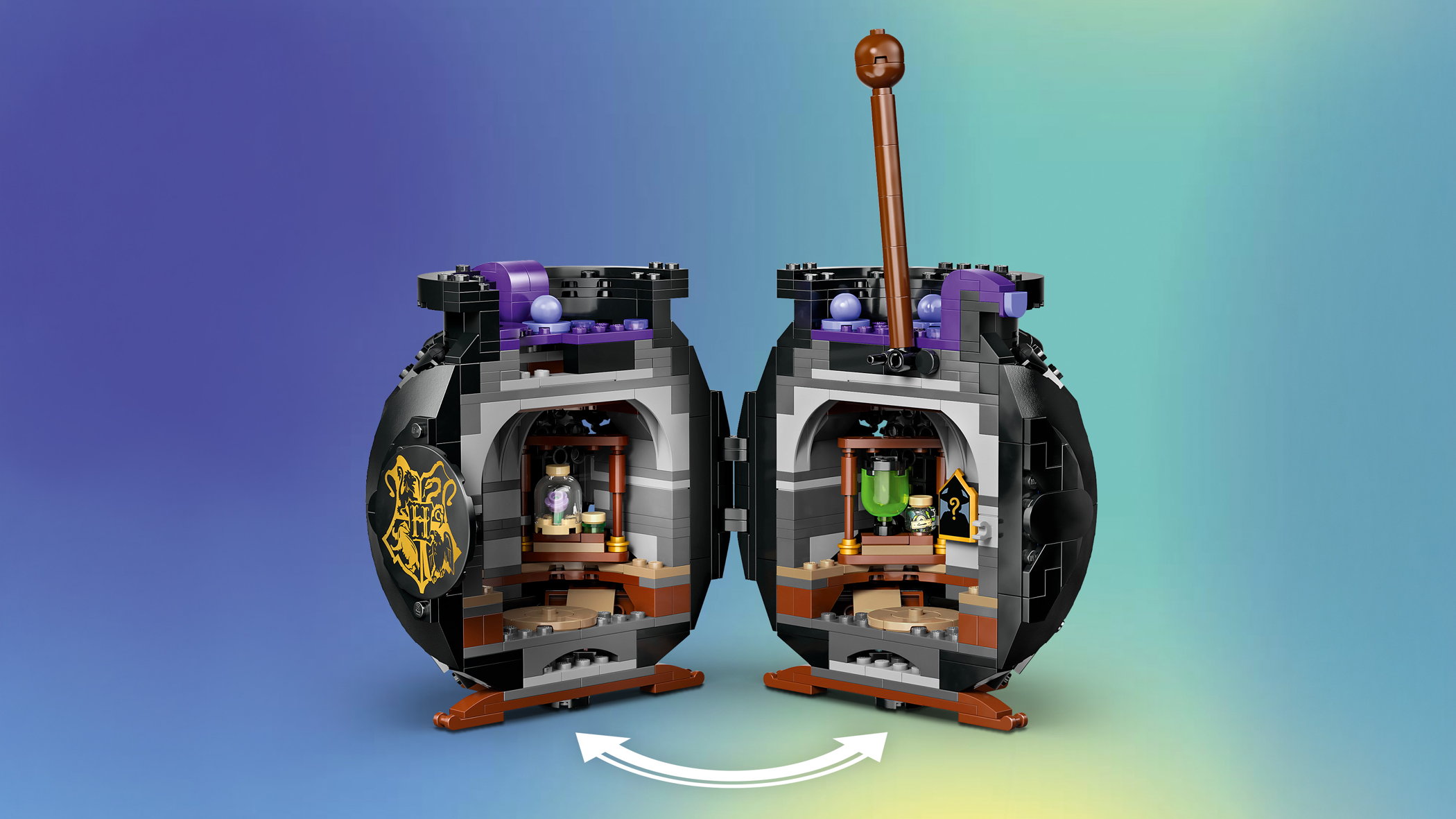 - GEHEIMES KLASSENZIMMER: Bewege den Rührstab, um das Klassenzimmer preiszugeben. Dort findest du herausnehmbare Tische, eine Tafel, Zaubertrankflaschen und LEGO® Zutaten für Wolfsbann-, Vielsaft- und Liebes-Tränke