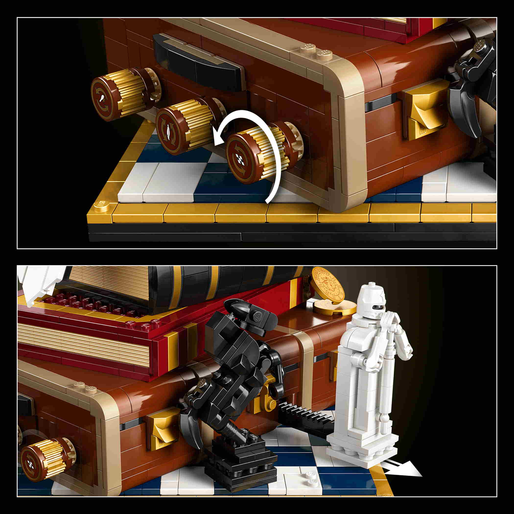- FASZINIERENDE FUNKTIONEN: Dreh die 3 Räder, um die Seite von Harry Potters Truhe abzusprengen und eine Filmszene im Mikromaßstab preiszugeben, Hedwigs Kopf zu schwenken oder die Dame auf dem Zauberschachbrett zu bewegen