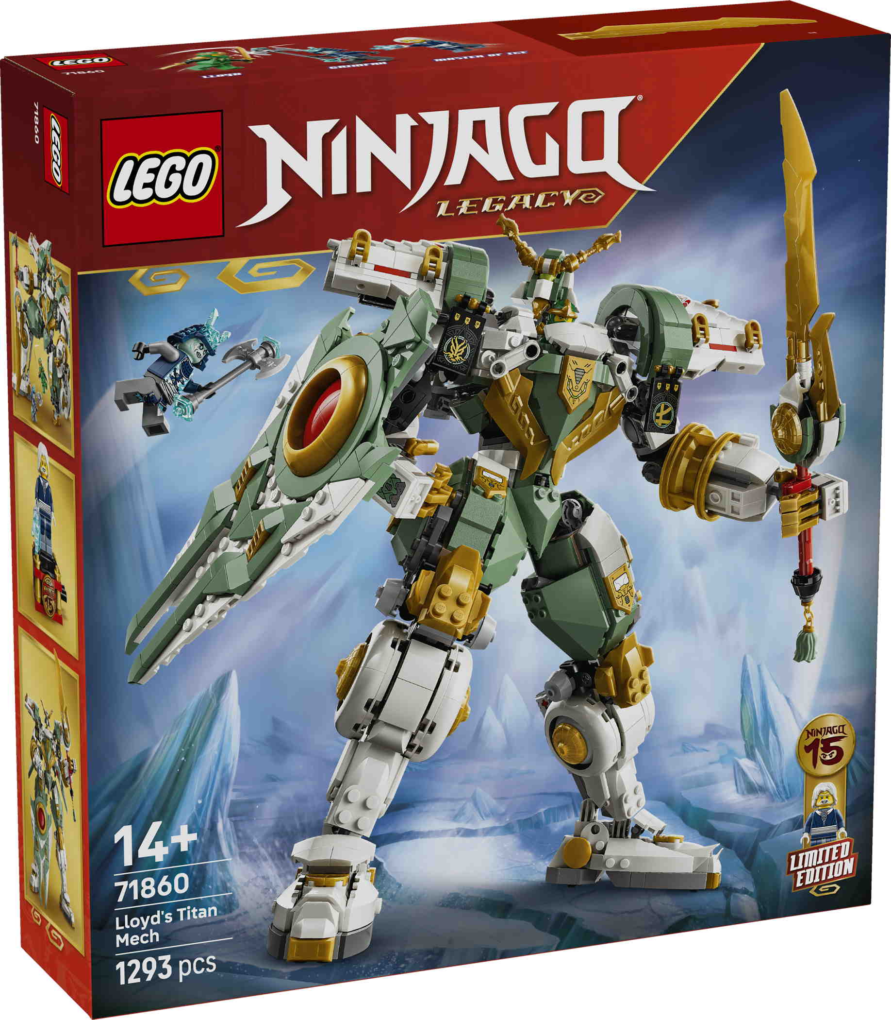 - Jugendliche und nostalgische Ninja-Fans ab 14 Jahren können das 15-jährige Jubiläum der LEGO® NINJAGO® TV-Serie mit diesem ebenso imposanten wie detailreichen Spielzeug-Mech feiern. LEGO® NINJAGO® 15-jähriges Jubiläum: Lloyds Titan-Mech (71860) ist eine aufgepeppte Version von Lloyds Titan-Mech (70676), der bei den Fans überaus beliebt war.Der Spielzeug-Mech kann unter anderem Flügel, Beine, Füße, Arme und Schultern bewegen und hat ein Cockpit für eine Minifigur. Die Actionfigur schwingt ein großes Schwert und trägt zum ersten Mal auch einen großen Schild. Du kannst den Schild teilen und zu Flügeln umfunktionieren und das Flügelpaar am Rücken befestigen.Zu dem Bauset gehören auch 3 Minifiguren. Lloyd, Grimfax und der Elementarmeister des Eises (auf einem Ständer) laden zum Spielen ein. Und die LEGO Builder App mit verständlichen digitalen Bauanleitungen lässt Ninja-Fans das Set selbstbewusst bauen, ein 3D-Modell vergrößern und drehen und verfolgen, wie weit sie mit ihrem Modell schon sind Das Bauset besteht aus 1.293 Teilen.