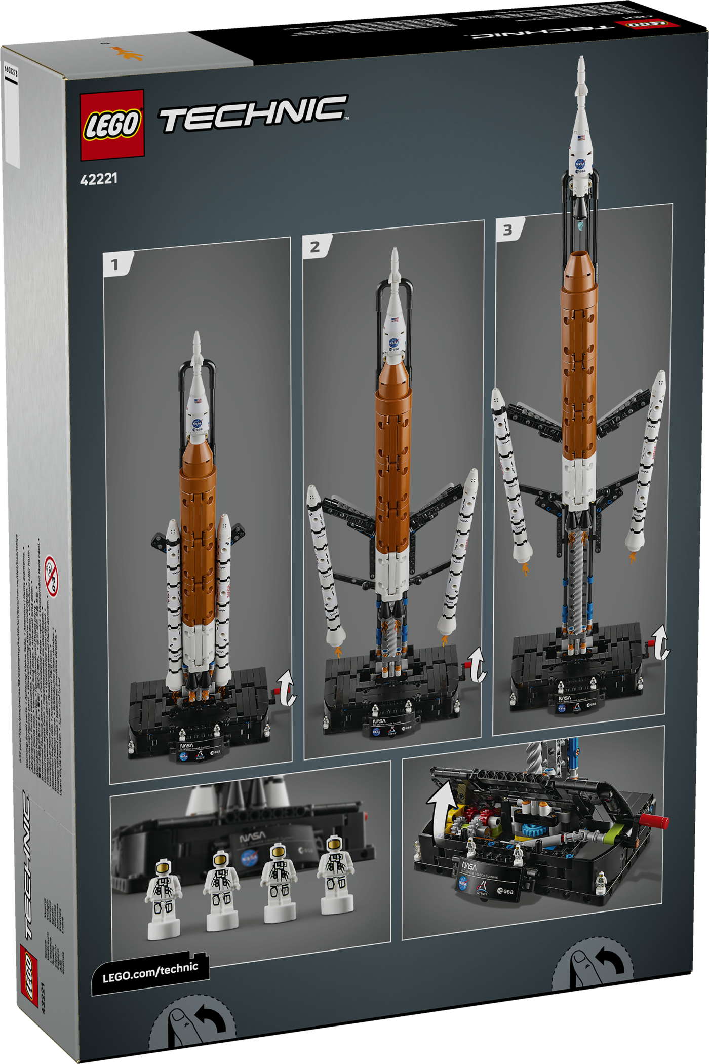 - Die NASA Artemis SLS-Schwerlastrakete (42221) ist ein Bauset, das Jungen und Mädchen ab 9 Jahren auf eine spannende Entdeckungsreise schickt. Dieses LEGO® Technic Lernset stellt den Moment des Raketenstarts und das gezielte Lösen der Raketenteile in 3 Stufen dar. Dreh die Kurbel, um die Feststoffbooster von der Kernstufe zu trennen, die sich dann ebenfalls löst. Schau dir an, wie sich anschließend auch die Oberstufe mit dem Triebwerksmodul, dem Raumschiff Orion und der Rettungsrakete löst.Dieses Bauset wurde in Zusammenarbeit mit der NASA und der ESA entwickelt, um Kinder das Space Launch System (Weltraum-Startsystem) erkunden zu lassen, mit dem das Raumschiff Orion in die Mondumlaufbahn gebracht werden soll. 4 Astronaut-Nanofiguren, coole blaue Flammenelemente sowie eine Infotafel vollenden den spektakulären Hingucker.Dieses LEGO Technic Bauset ist ein tolles Geschenk für Weltraumfans. Die LEGO Builder App mit verständlichen digitalen Bauanleitungen lässt Kinder selbstbewusst bauen, 3D-Modellansichten vergrößern und drehen und den Baufortschritt verfolgen. Das Set besteht aus 632 Teilen.