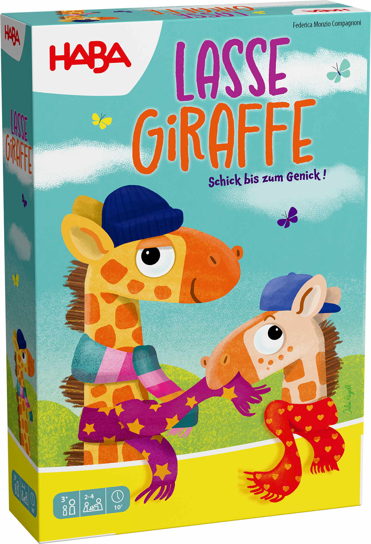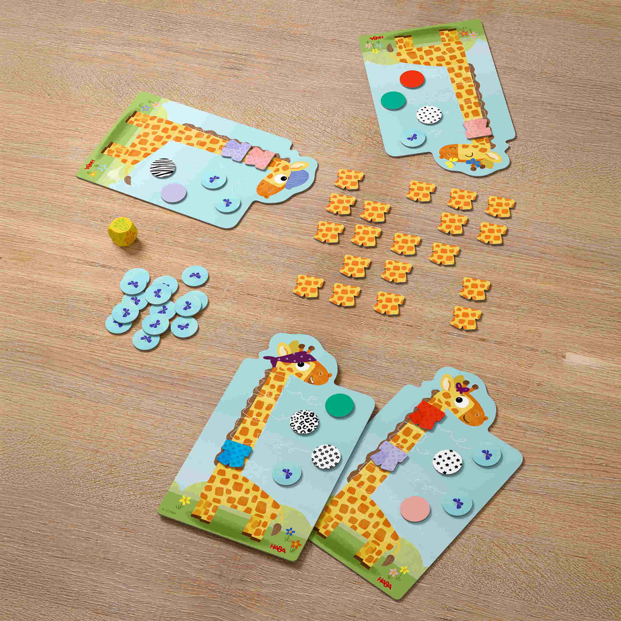 Haben Giraffen lange Hälse? Klar, das weiß doch jedes Kind! Weniger bekannt ist jedoch, dass Giraffen auch sehr modebewusst sind. Lasse und seine Geschwister mögen zum Beispiel bunte Schals – am liebsten gleich mehrere auf einmal! Aber Achtung: Getragen wird nur, was gefällt! Wer macht die eigene Giraffe zuerst mit vier Schals glücklich?