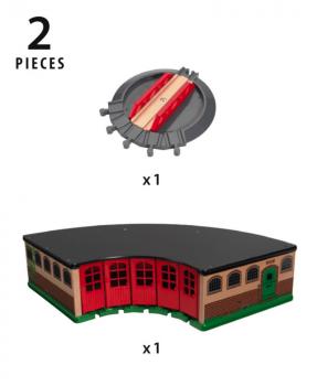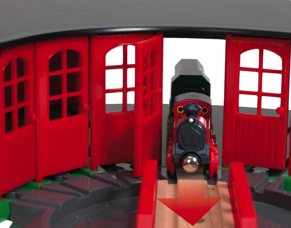 Wo werden die Züge abgestellt? Im großen Ringlokschuppen natürlich!Nimm die Drehscheibe, um die Züge gleich auf ihre individuellen Plätzezu stellen. Die hinteren Türen können geöffnet werden, was das Durchfahrenvon der Rückseite ebenso ermöglicht. Es passen fünf Fahrzeugehinein und eine drehbare Weiche ist außerdem enthalten.