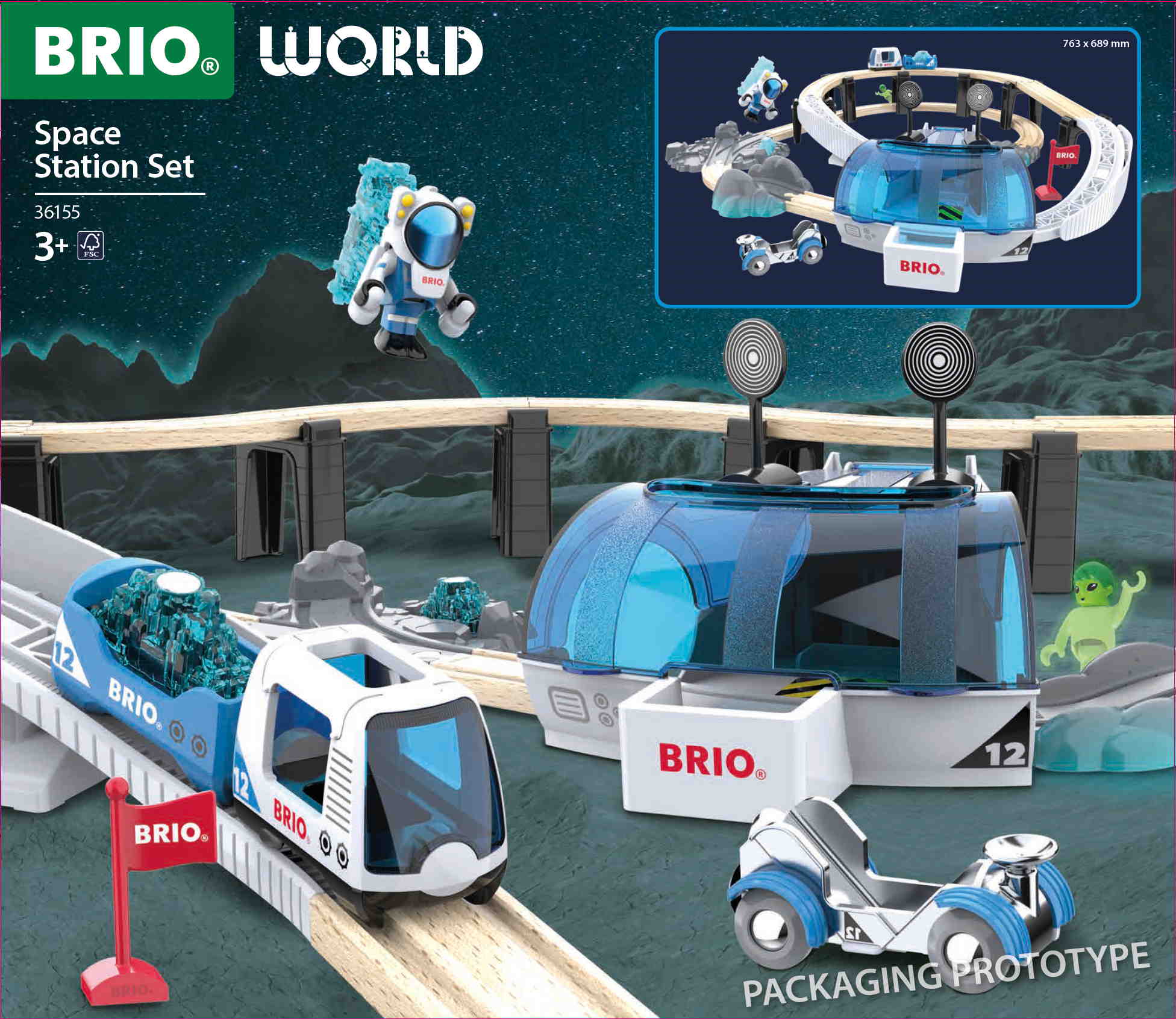 Das große Weltaumstations-Set 36155 enthält 40 Teile: 1x Raumstation, 1x Shuttle-Wagen, 1x Monorail-Wagen, 1x Rover, 1x Astronautenfigur, 1x Alienfigur, 1x Raumanzug, 2x Landschaftsbahnen, 13x Holzbahnteile und diverses Zubehör