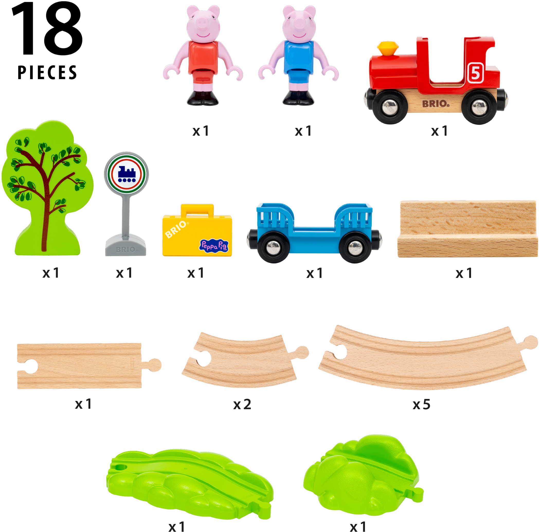 EISENBAHN-SET FÜR KLEINKINDER - Die farbenfrohe Lok wird mit der Hand über die Schienen geschoben während die Spielfiguren Peppa und George in der Lok und dem Wagen sitzen oder am Gleis auf die nächste Abfahrt warten.