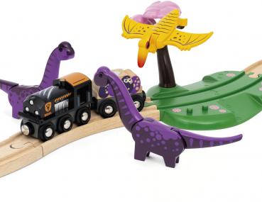 Das Dinosaurier Abenteuer-Set zeigt die erstaunliche prähistorische Welt der Dinosaurier. Das 21-teilige Zugset steckt voller Spielspaß zum Thema Dinosaurier und umfasst einen Zug mit zwei Waggons, mehrere Landschaftselemente wie die gefährliche Lavahöhle und grasüberwucherte Schienen sowie Gleisverläufe auf verschiedenen Ebenen. Dazu gehören auch drei verspielte und farbenfrohe Dinosaurier mit beweglichen Teilen und klassischen BRIO-Magneten, die mit der sie umgebenden Welt interagieren können.